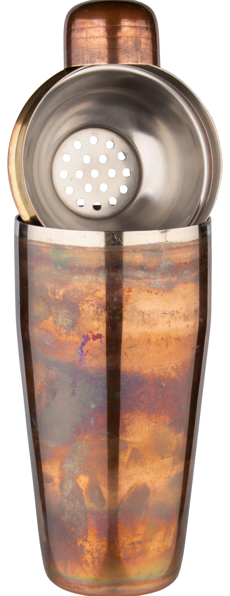 Was diesen speziellen Cocktailshaker so aufsehenerregend macht, ist seine Vintage-Optik. Außen schimmern alle drei Bestandteile wie alterndes Kupfer, obwohl der Shaker aus Edelstahl gefertigt wurde. Das Finish lässt das Metall schillern und wirkt edel.