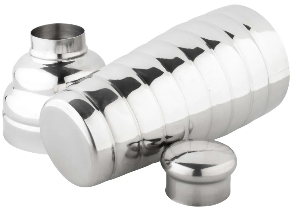 Der Cocktail Shaker ist komplett aus Edelstahl gefertigt und außen poliert. Alle drei Bestandteile sind mit umlaufenden horizontalen Rillen versehen. Das erzeugt den Eindruck, als sei der Shaker aus mehreren breiten Ringen zusammengesetzt. In Kombination mit der polierten Oberfläche sorgt diese Form dafür, dass sich die Umgebung mehrfach und unterschiedlich verzerrt im Shaker widerspiegelt. Das Design hat darüberhinaus einen praktischen Nutzen, da es der Hand schmeichelt und der Shaker sicher gehalten werden kann.