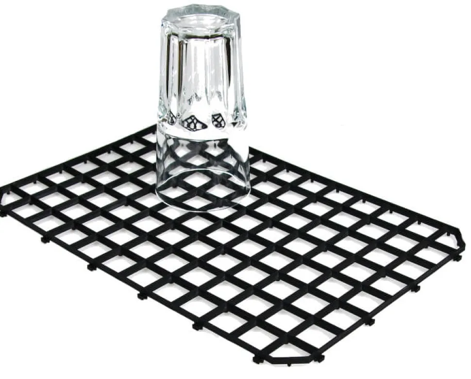 Stellen Sie die Gläser nach dem Waschen auf die Plastikgitter und durch die zirkulierende Luft trocknen die Gläser schnell ab. Zum einen schont die flexible Kunststoffmatte den Glasrand und zum anderen müssen Sie so weniger nachpolieren.