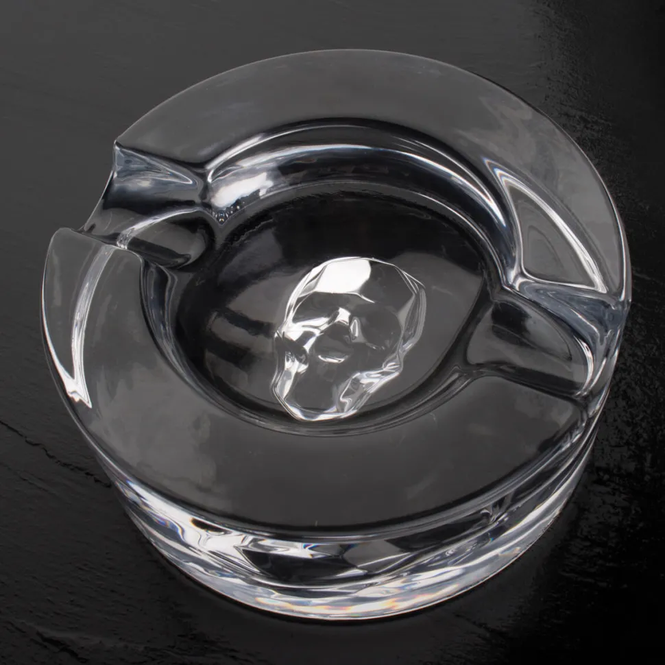 Dieser große Glas-Aschenbecher aus der Shade-Serie verbindet auf außergewöhnliche Weise moderne Eleganz mit der brutalen Schönheit von Vergänglichkeit. In dem massiven Glasboden scheint ein Totenschädel zu liegen, der von oben und von allen Seiten sichtbar ist und das Licht spiegelt. Die geschliffenen Kanten des Schädels machen ihn einem Diamanten ähnlich, was dem Aschenbecher Glanz verleiht, ohne die dramatische Wirkung des Totenschädels zu zerstören. Besonders eindrucksvoll ist der Effekt von der Seite betrachtet, wenn der Totenkopf durch optische Verzerrungen plötzlich überdimensional erscheint.