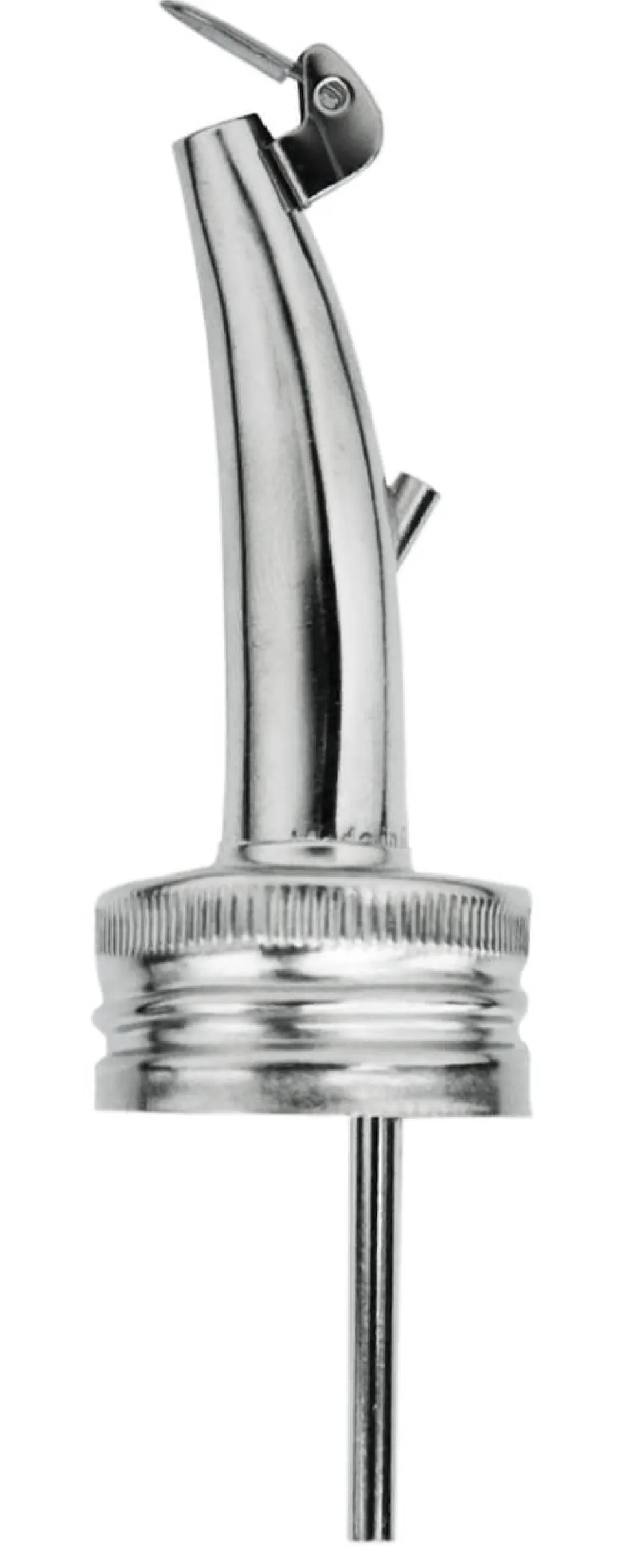 Der Ausgießer besteht aus Metall, ist mit einem genormten Schraubgewinde versehen und hat innenliegend eine Dichtung aus Kork mit Folienüberzug. Somit sitzt er fest und tropffrei auf der Flasche.