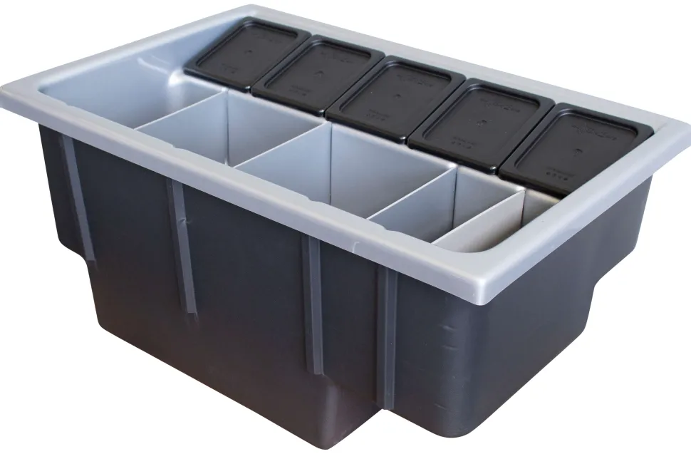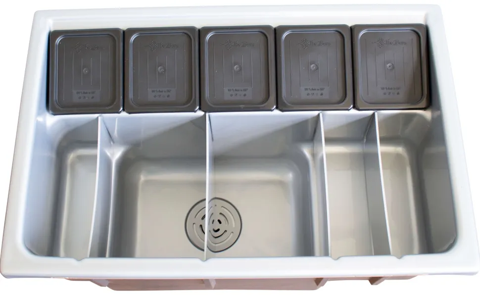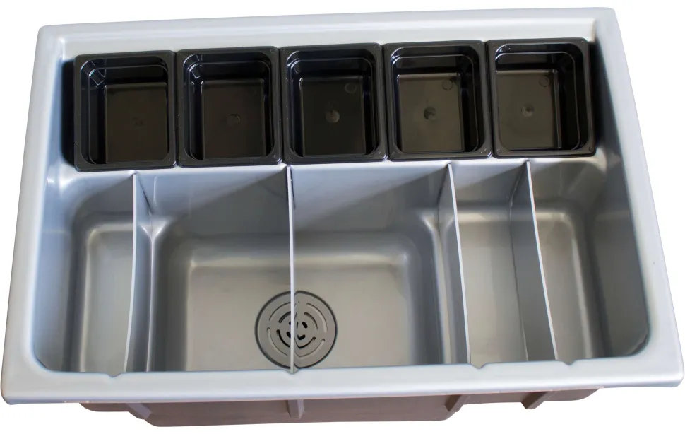 Die sechs schwarzen Fächer unterteilen sich: in 4 kleine 1/9 Gastrobehälter undin 2 große 1/6 Behälter. Unter den Fächern findet sich auch Platz für crushed Eis,um Ihre Cocktailzutaten zu kühlen. Auch hier bietet Ihnen die Arbeitsstation für Barkeeper einen Ablauf für das Tropfwasser.