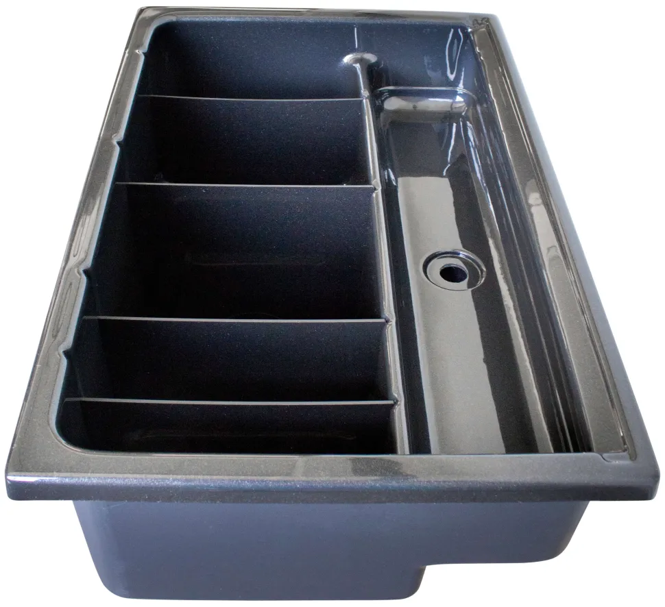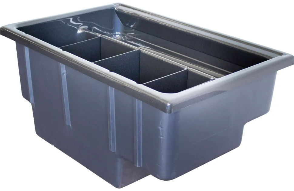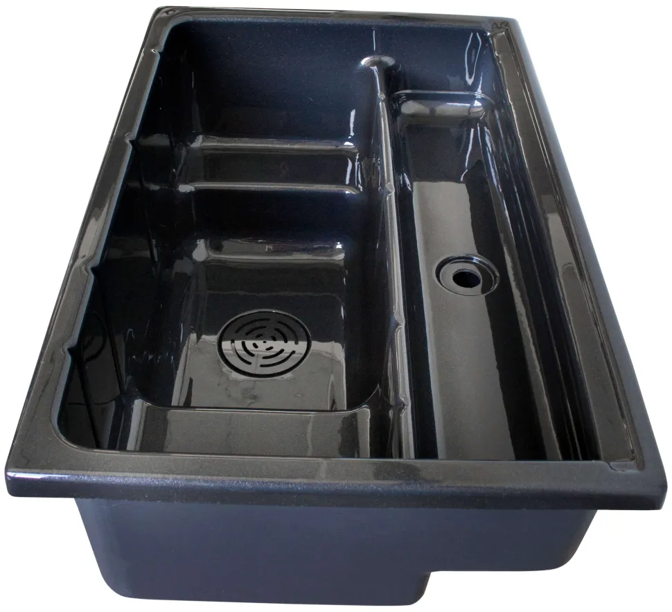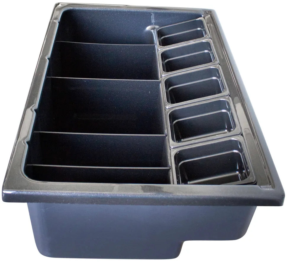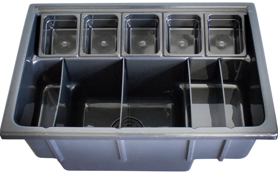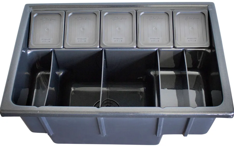 Die Barstation kann in eine passende Aussparung in der Arbeitsplatte eingesetzt werden. Im vorderen Bereich verfügt die Station über zwei große Fächer für Crushed Ice und Eiswürfel. Das Schmelzwasser fließt durch ein Ablaufgitter direkt ab. Zusätzlich kann ein Abflussrohr angeschraubt werden. Links und rechts der Eisfächer bieten insgesamt drei Fächer Platz für häufig verwendete Flaschen. Die vier Trennwände der Bar Station können zur Reinigung herausgenommen werden. Im hinteren Bereich bieten fünf kleinere, verschließbare Behälter Platz für Zutaten. Um die Zutaten kühl und frisch zu halten, füllen Sie einfach Crushed Ice in die Wanne unter diesen Fächern. Auch diese verfügt über einen Abfluss für Schmelzwasser.