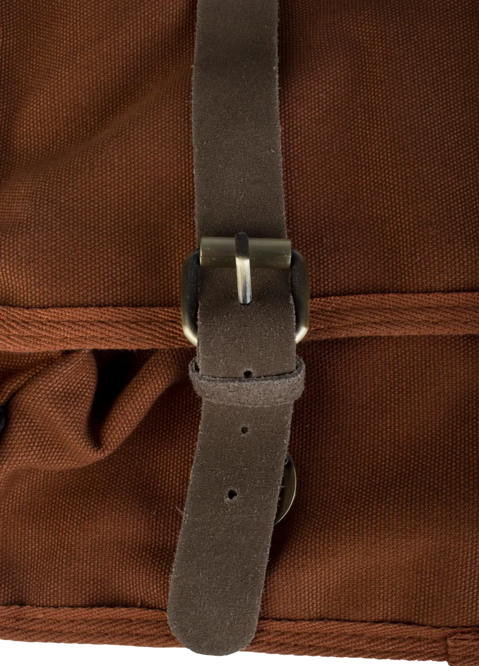 Die braune Leinentasche ist ca. 37cm breit und verfügt für den Transport über einen einfachen Tragegurt, der auch abnehmbar ist. Wenn Sie mit der Arbeit beginnen, rollen Sie die Tasche einfach auseinander. Aufgerollt betragen die maximalen Maße 50x37cm. Nun lösen Sie noch die Klettverschlüsse und klappen den Schutz aus Leinen auseinander. Im Inneren der Tasche sind die Bartools mit dehnbaren, breiten Bändern und in eingenähten Einschub-Taschen befestigt, so dass alles gut überschaubar ist. Shakerbecher und Mixingglas werden in einem länglichen Fach mit Reißverschluss verstaut. Je nachdem, wie Sie die Tasche befüllen, ist noch Platz für weitere kleine Bartools, die Sie entweder bereits besitzen oder noch nachkaufen können.