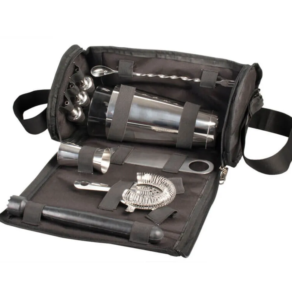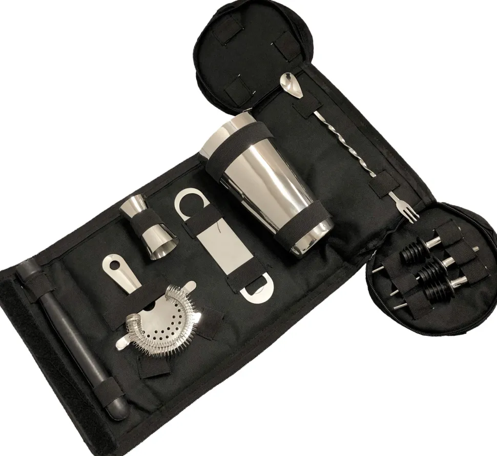 Diese Bartasche beinhaltet einen Boston Shaker mit Mixing Glas, einen passenden Strainer, einen Doppelmessbecher mit den Maßen 20ml und 40ml, 3 Ausgießer, einen Speedopener Flaschenöffner, einen Barlöffel und einen Barstößel. Die Tasche lässt sich zum Transport zusammenrollen und mit Reißverschluss sowie Klettverschluss verschließen. Innen sind Gummizüge eingenäht, welche das Barwerkzeug an Ort und Stelle halten.