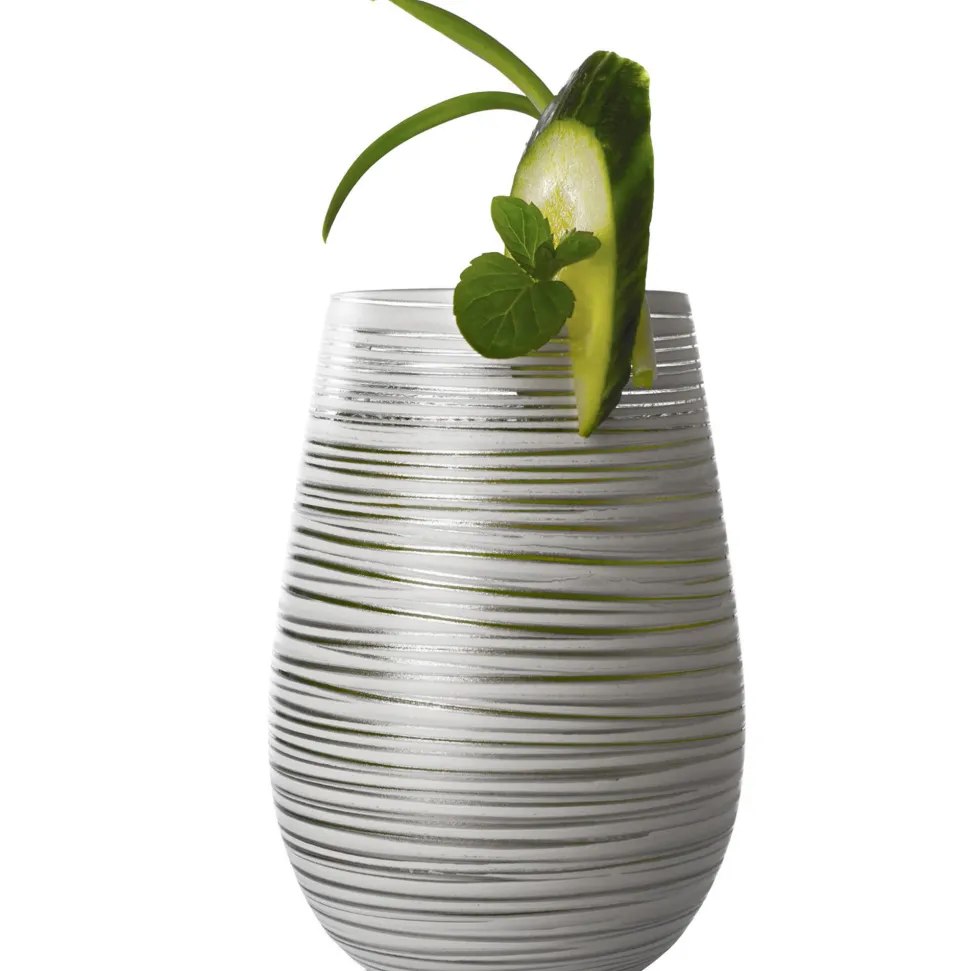 Dieser Becher scheint schlicht in einem weißen Gewand, das von gräulich silberfarbenen Linien durchzogen wird. Die matte Struktur auf der Außenseite des Glases ist auch ein besonderes haptisches Erlebnis. Von Innen scheint die silbrige Farbe durch das Kristallglas, jedoch ist das Glas dort glatt. Die Becherform liegt angenehm in der Hand und ist für viele Getränkesorten von einfachem Wasser bis hin zu Longdrinks geeignet.