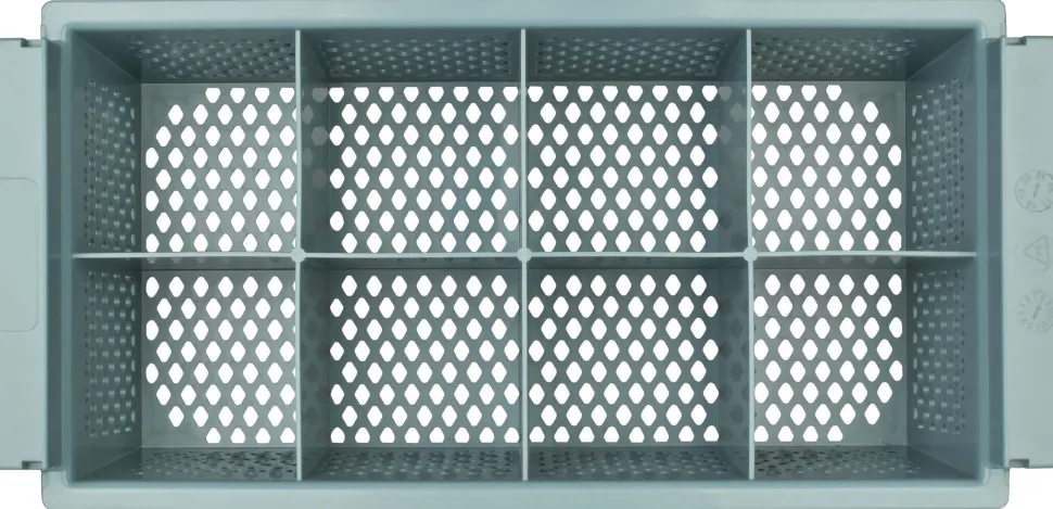 Insgesamt verfügt der Spülkorb über 8 gleich große, quadratische Fächer, die eine Innenhöhe von 11,3cm haben. Die Fächer sind durch geschlossene Platten voneinander getrennt, während die Außenseiten des Korbs über und über mit rautenförmigen Löchern übersäht sind. Durch sie kann das Spülwasser problemlos von allen Seiten das Besteck erreichen. Dabei steht der Korb auf vier rechtwinkligen Füßchen (8mm hoch), damit das Wasser gut ablaufen kann.