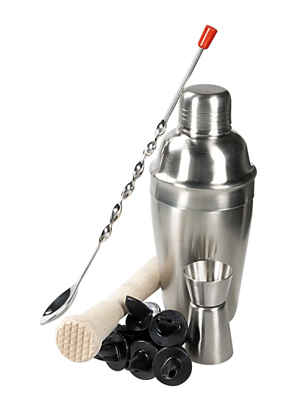 ShakerDer dreiteilige Shaker aus Edelstahl ist das Herzstück des Sets. Wie bei diesen Cocktail-Shakern üblich, ist ein Sieb bereits integriert. Folgerichtig ist ein Strainer (Barsieb) nicht notwendig und gehört von daher auch nicht zu der Ausstattung dieser Variante unserer Cocktail Sets. Der Shaker hat ein Volumen von 500ml und eine matte Oberfläche. Er setzt sich zusammen aus Deckel, Aufsatz mit Sieb und Becher zusammen.