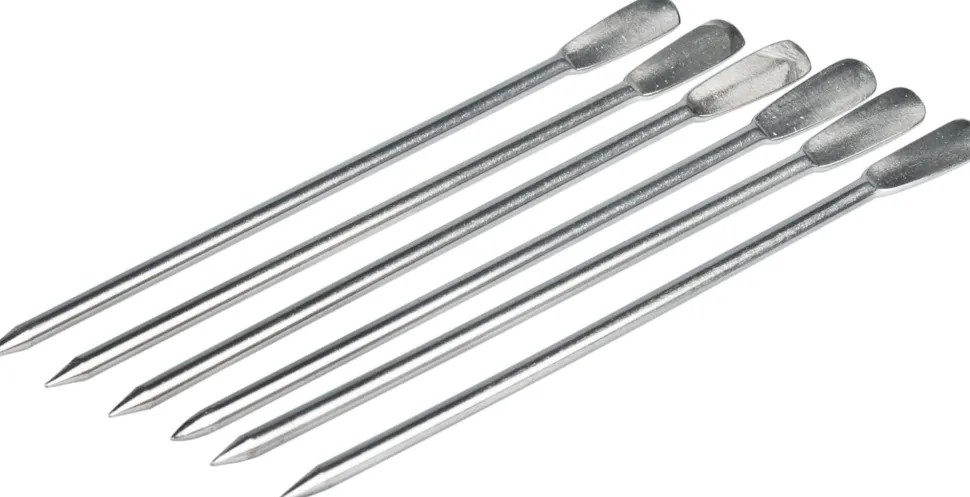 Die Metallspieße sind im 6er Karton erhältlich und haben am einen Ende einen handlichen, Paddel-förmigen Griff.