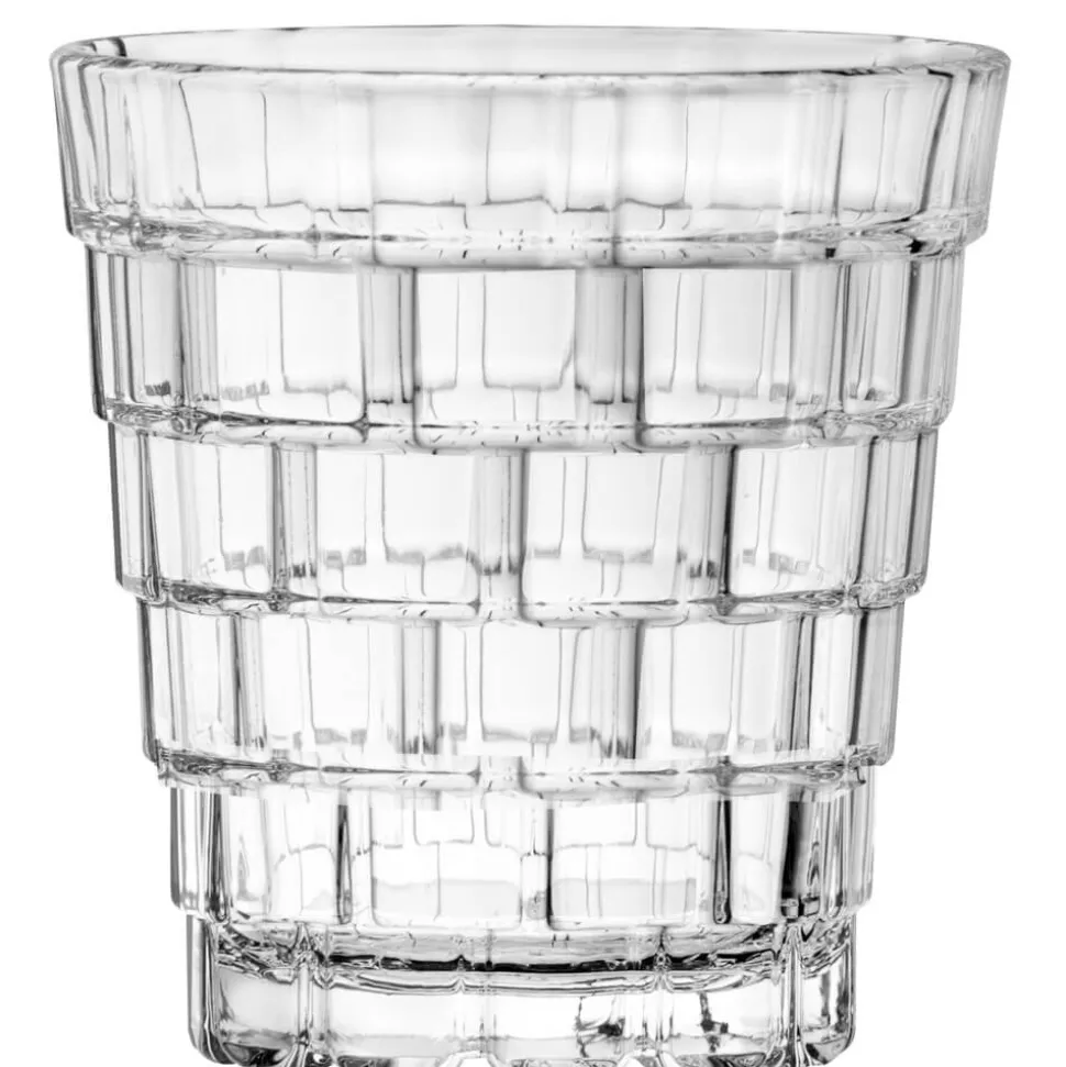 Die einzigartige Prägung des Stack D.O.F. Glases könnte unbefüllt zunächst den Eindruck erwecken, sie wäre einer Backsteinmauer nachempfunden – gerade mit Inhalt sieht man jedoch, dass die ungleichmäßig verteilten Kacheln nach oben hin größer werdende Zwischenräume haben und eher einen “schwebenden” Eindruck erwecken! Das Design ist gerade bei entsprechender Beleuchtung ein Hingucker und fühlt sich zudem interessant an. Unter dem Glasboden sorgt ein Ring aus soliden Glasfüßen für einen sicheren Stand.