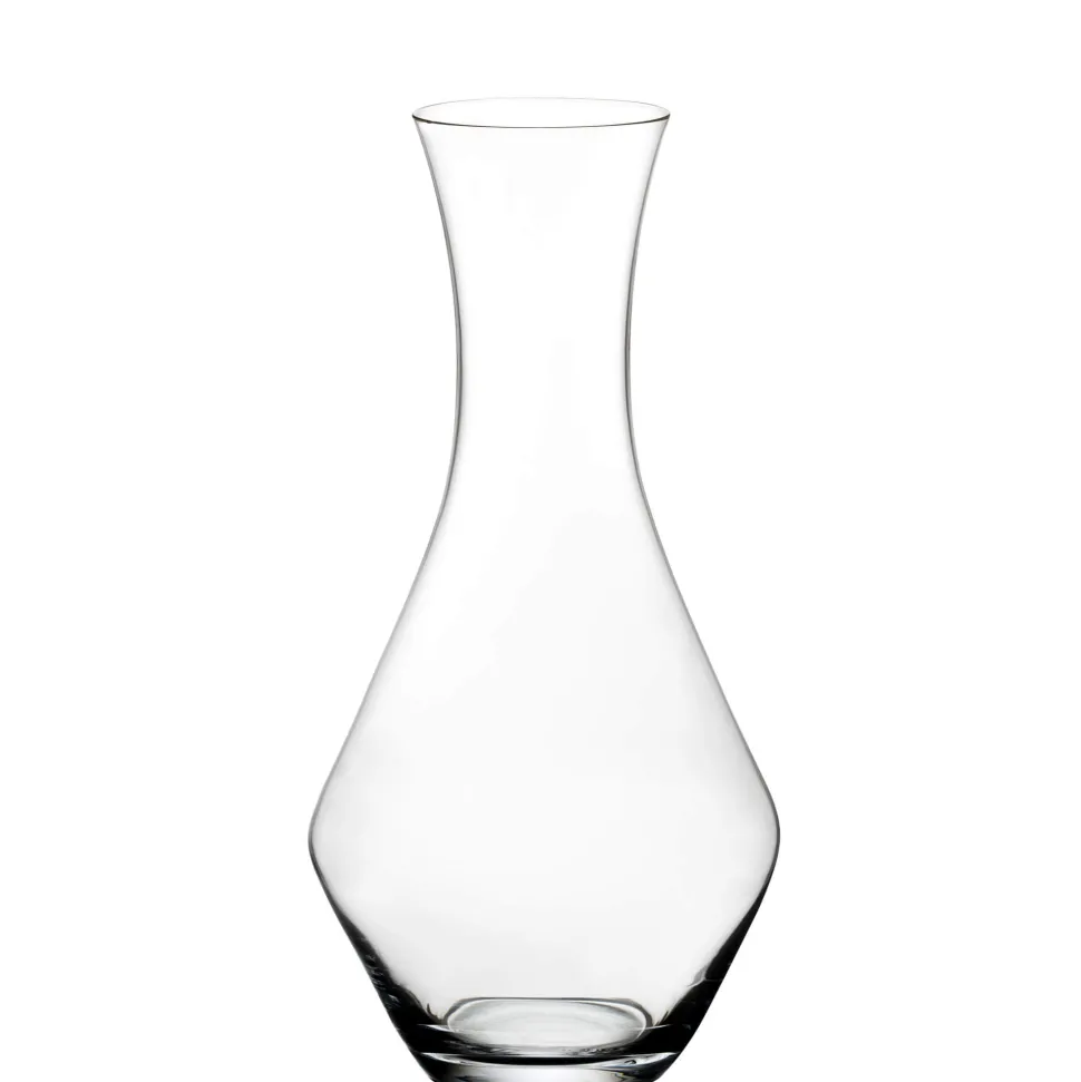 Die Dekantierkaraffe verfügt über einen hohen Hals mit weit offenem Rand. Dieser verhindert zum einen das entfliehen essentieller Duft- und Aromastoffe aus dem Gefäß, und eignet sich nebenbei gut als Karaffengriff und kleckerfreie Einfüllhilfe. Nach unten hin öffnet sich der Hals zu einem eher hohen als breiten Flaschenbauch. Dessen Seitenwände formen zum Zentrum hin eine konvexe Ausbuchtung in Form einer engen, fast kantigen Kurve. Dies stellt einen ansprechenden Gegenpol zur schlanken, konkav geschwungenen Form des Halses dar und haucht dem Dekanter einen einzigartigen Glamour ein, welcher durch die Brillanz des hochwertigen Kristallglases weiter verstärkt wird.