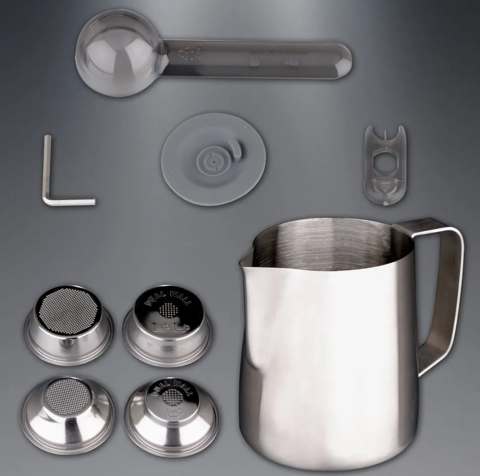 Letztlich wird die Maschine mit integrierten, ausfahrbaren Rollen für eine leichtere Reinigung und einer beheizten Warmhalteplatte für bis zu 6 Tassen abgerundet. Die Maschine wird weiterhin mit folgendem Zubehöre geliefert: 58mm Edelstahl-Siebträger, Edelstahl-Milchschaumkännchen, Messlöffel, Espresso-Tamper, Reinigungswerkzeug mit Bürste, Reinigungseinsatz und je zwei Einzel- und Doppelwandsiebeinsätze.