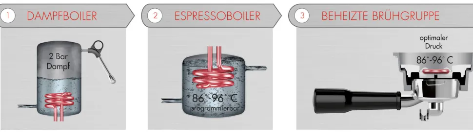 Das Dual Boiler System ist aus Edelstahl gefertigt und ermöglicht Ihnen die gleichzeitige Zubereitung von Espresso und Milchschaum, was Ihnen Zeit erspart und den Kunden nicht lange auf seinen geliebten Cappuccino oder Latte Macchiato warten lässt. Weiterhin ist die Maschine mit einem PID-Regler versehen, welcher Ihnen eine konstante Brühwassertemperatur unabhängig vom Volumen ermöglicht und diese überwacht. Die Espressopumpe arbeitet mit dem perfekten Espresso-Druck von 15 bar und sorgt so für perfekt gebrühte Getränke.