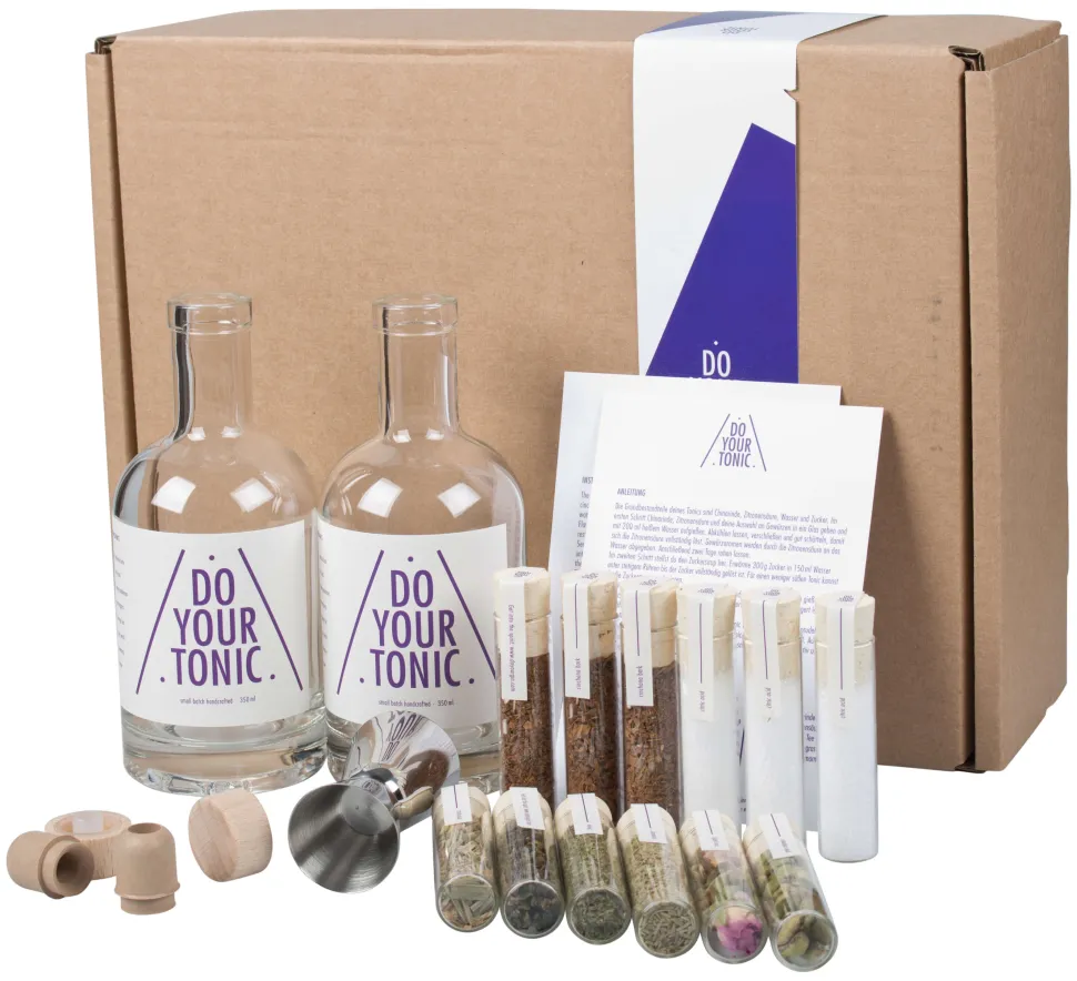 Um einen wirklich individuellen Gin Tonic zu kreieren, gibt es das Do Your Tonic Set. Damit stellen Sie zu Hause selbst Tonic Water ganz nach Ihren eigenen Vorlieben und Ideen her. Zusätzlich zum Set benötigen Sie nur noch Zucker für den Zuckersirup und natürlich Sprudelwasser, um aus dem Tonic ein Tonic Water zu machen.