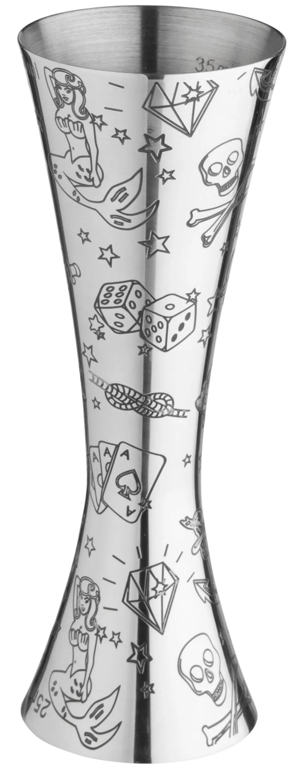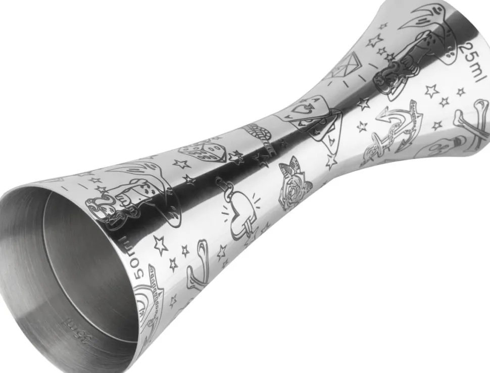 Den Jigger zieren Totenköpfe, durchbohrte Herzen, Meerjungfrauen, Anker und andere klassische Tattoo-Motive. Durch den Kontrast zum glänzenden Edelstahl und die aerodynamische Form wirkt das Barmaß dennoch modern und holt die Zeit der beinharten Seemänner in die Gegenwart.