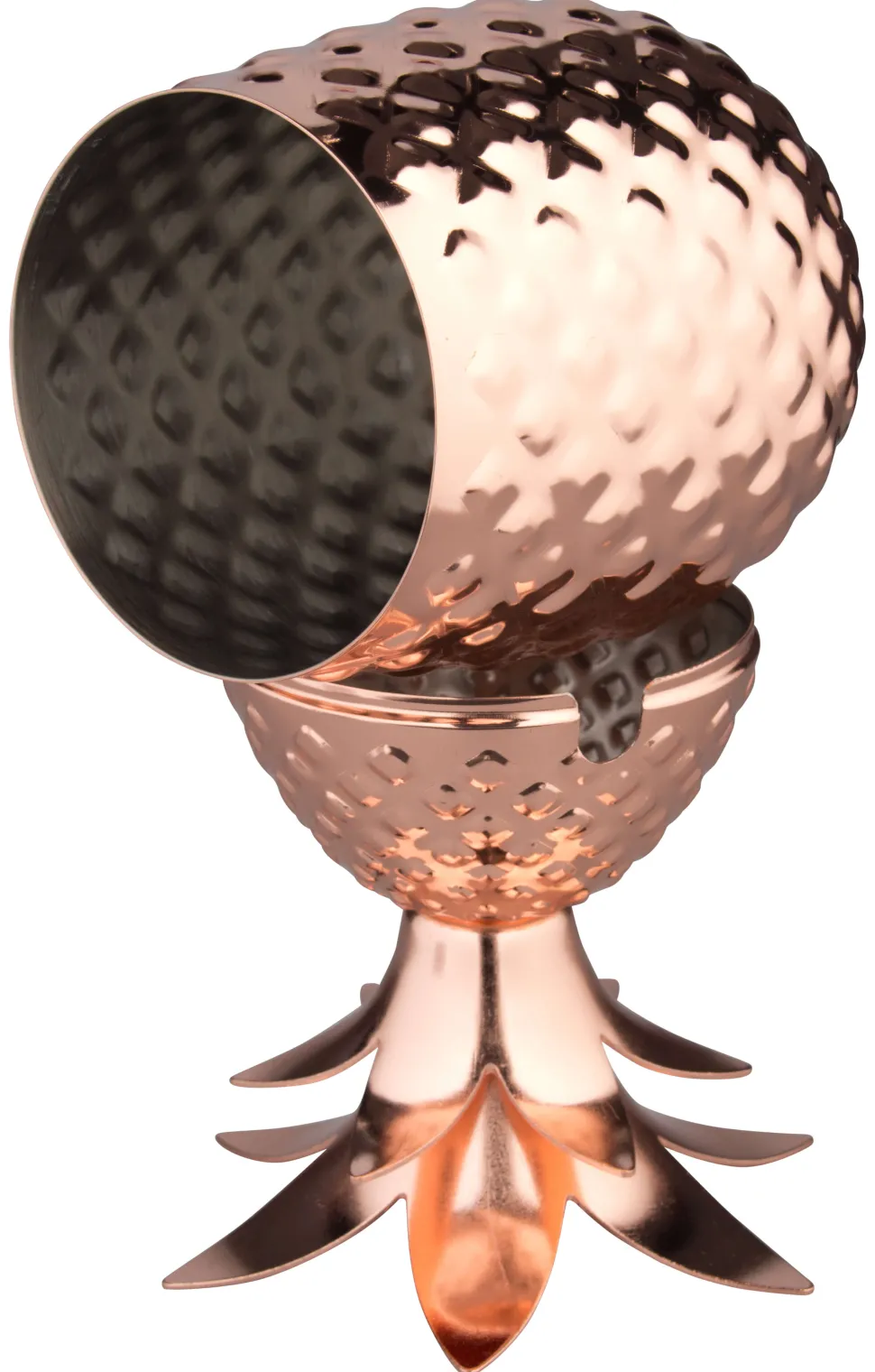 Dieser 500ml fassende Edelstahl-Becher hat außen einen schicken Überzug im angesagten Kupfer-Look. Innen ist der Cocktailbecher silberfarben. Der Clou ist ein optisch passender Deckel mit einer kleinen Aussparung für den Trinkhalm (am besten passt natürlich ein umweltfreundlicher, kupferfarbener Edelstahl-Trinkhalm). Nutzen Sie den Deckel, um das Getränk vor Insekten zu schützen oder einfach als Dekoration. Wer mutig genug ist, macht aus dem Deckel ein Podest: Der bauchige Becher kann auf den „Blättern“ stehen – und das sogar in Schräglage. Ihre Gäste werden eine kindliche Freude daran haben.