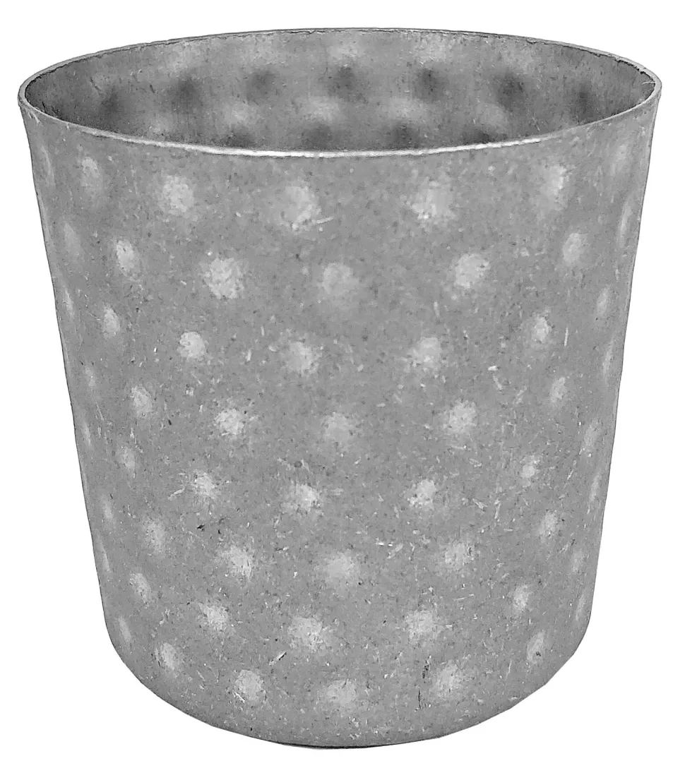 Der Becher ist leicht konisch geformt mit einem Durchmesser zwischen 7cm am Boden und 8,5cm am Rand.Die Oberfläche wurde so behandelt, dass sie wie zerkratztes Metall wirkt, sich aber leicht samtig anfühlt. Optisch bildet das matt-samtige Grau-Silber einen spannenden Kontrast zu polierten Edelstahloberflächen.