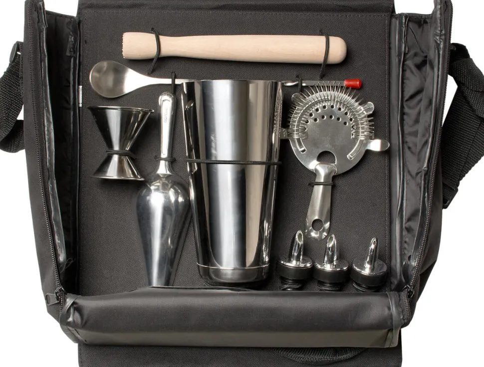 Nach dem Öffnen der Tasche haben Sie die Möglichkeit das Barset komplett herauszunehmen, da der innen liegende Träger durch Klett an der Tasche befestigt wird. Die einzelnen Teile sind durch Gummis am Träger gesichert.