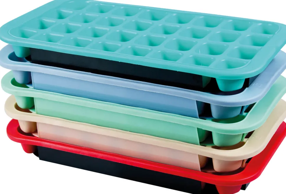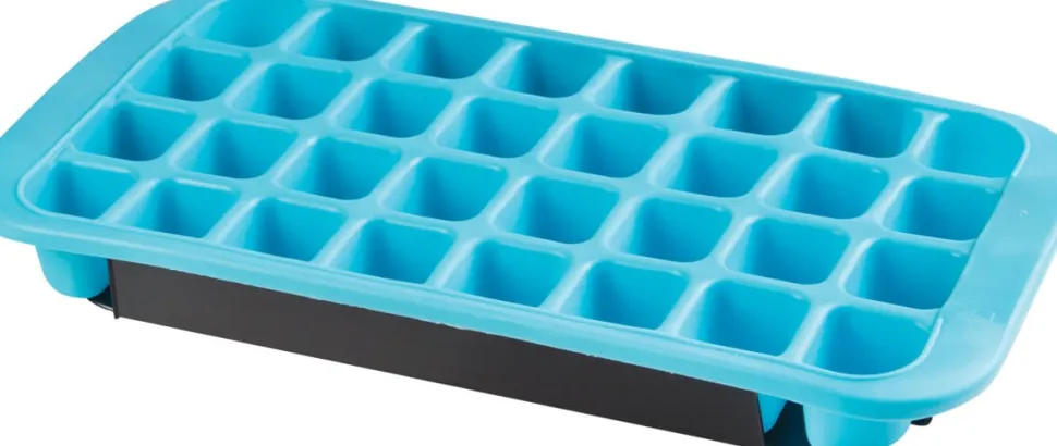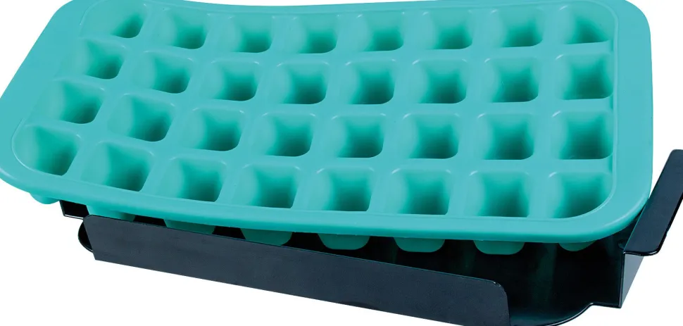 Zur Eiswürfelform gehört auch ein Kunststofftablett. Damit können Sie die Form auch im vollen Zustand schnell von einem zum anderen Ort transportieren. Außerdem können mehrere der Eiswürfelformen übereinander gestapelt werden. So sparen Sie wertvollen Platz im Eisfach. Alle Teile sind voneinander trennbar und einfach zu reinigen. Die Eiswürfel messen 3,7×3,2cm.