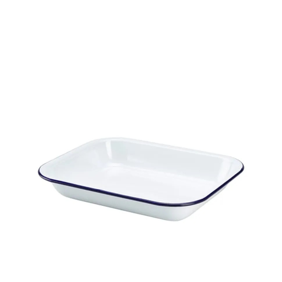 Produktdaten für Emaille-Auflaufform, weiß mit blauem Rand – 28 x 23 x 4,5 cm