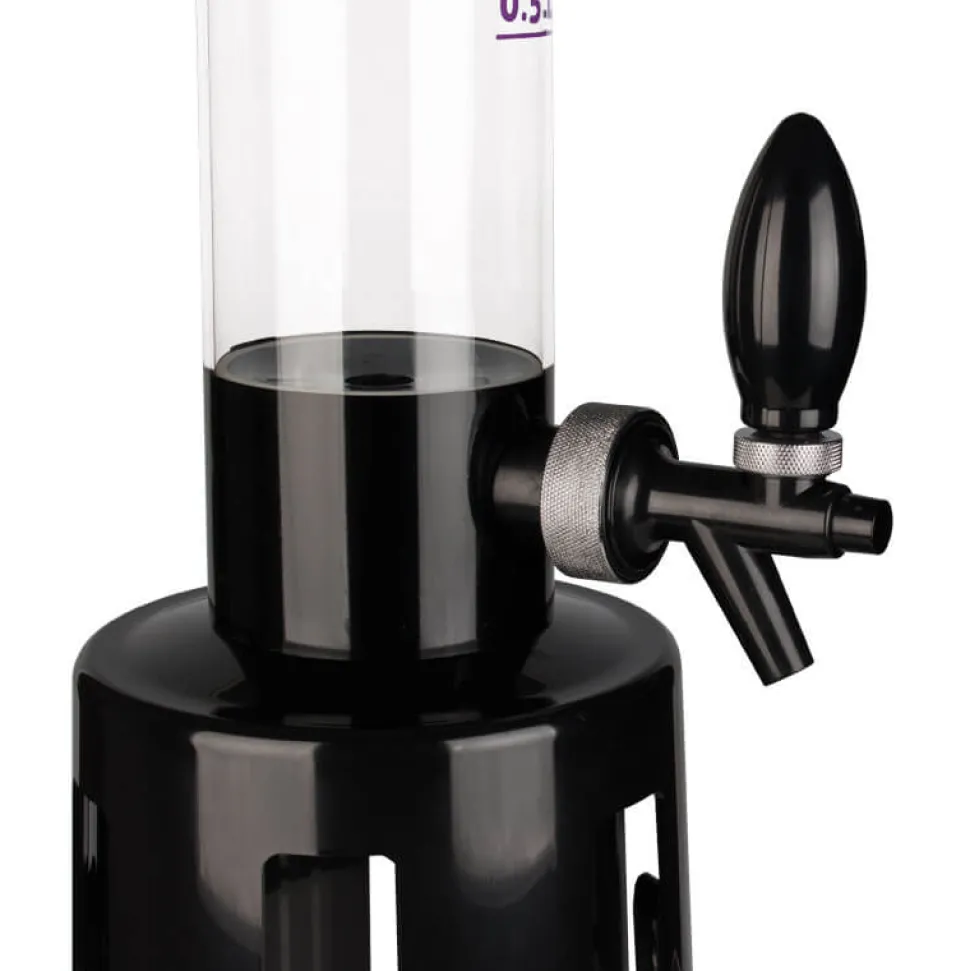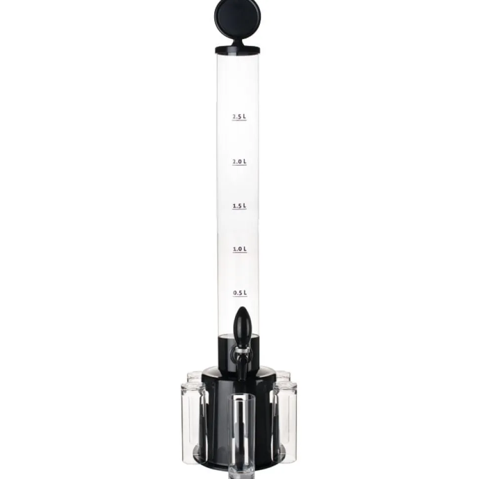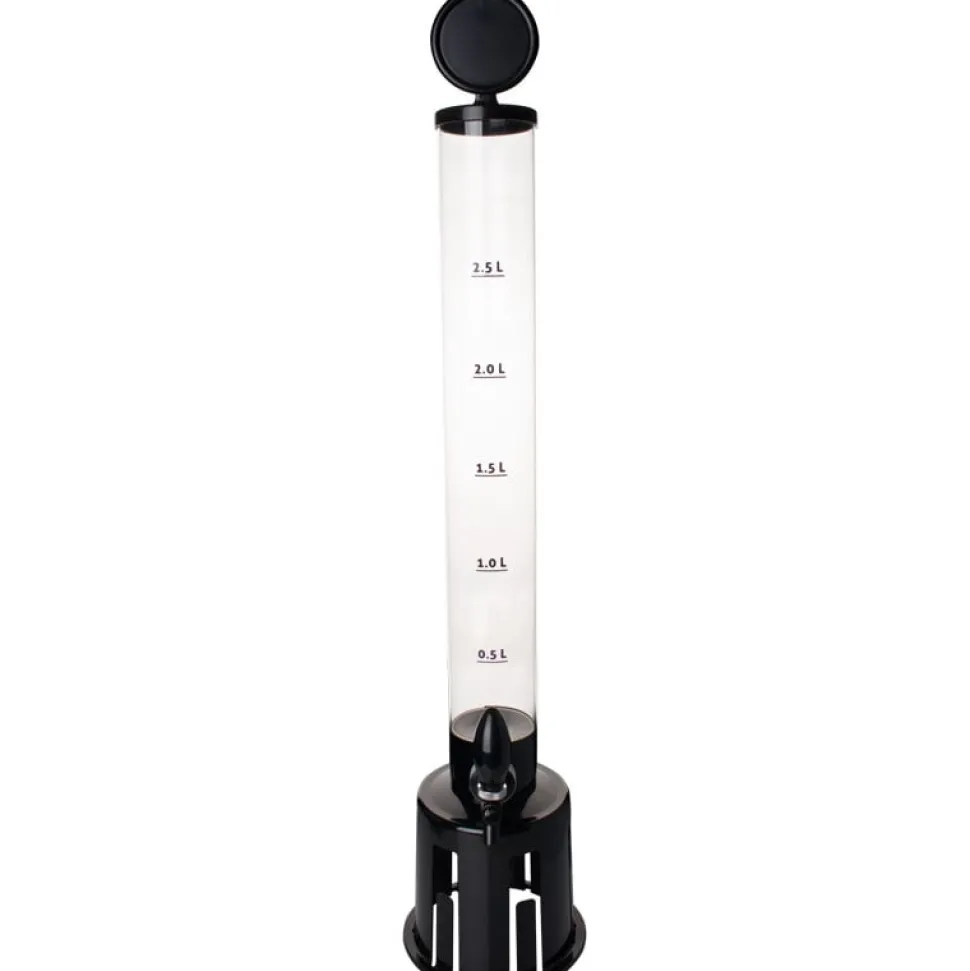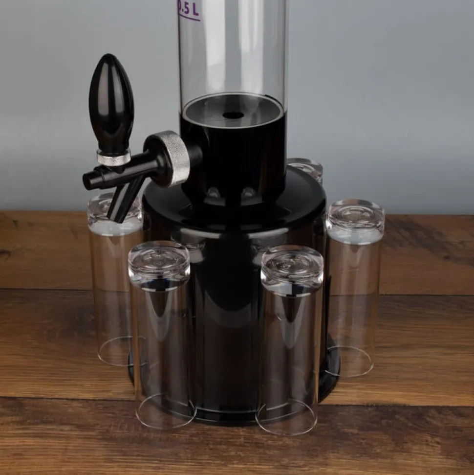 Alle Bestandteile des Towers bestehen aus Kunststoff: die schwarzen Teile aus ABS und die Röhre aus PMMA. PMMA ist auch als Acrylglas bekannt und ist ein sehr transparenter und stabiler Kunststoff, welcher zudem BPA-frei und lebensmittelecht ist. Die Wandstärke der Röhre beträgt etwa 3mm. Die praktische Skala hat Fülllinien im Abstand von 0,5l und geht bis 2,5l. Bis zum Rand gefüllt passen allerdings 3,25l in den Biertower!