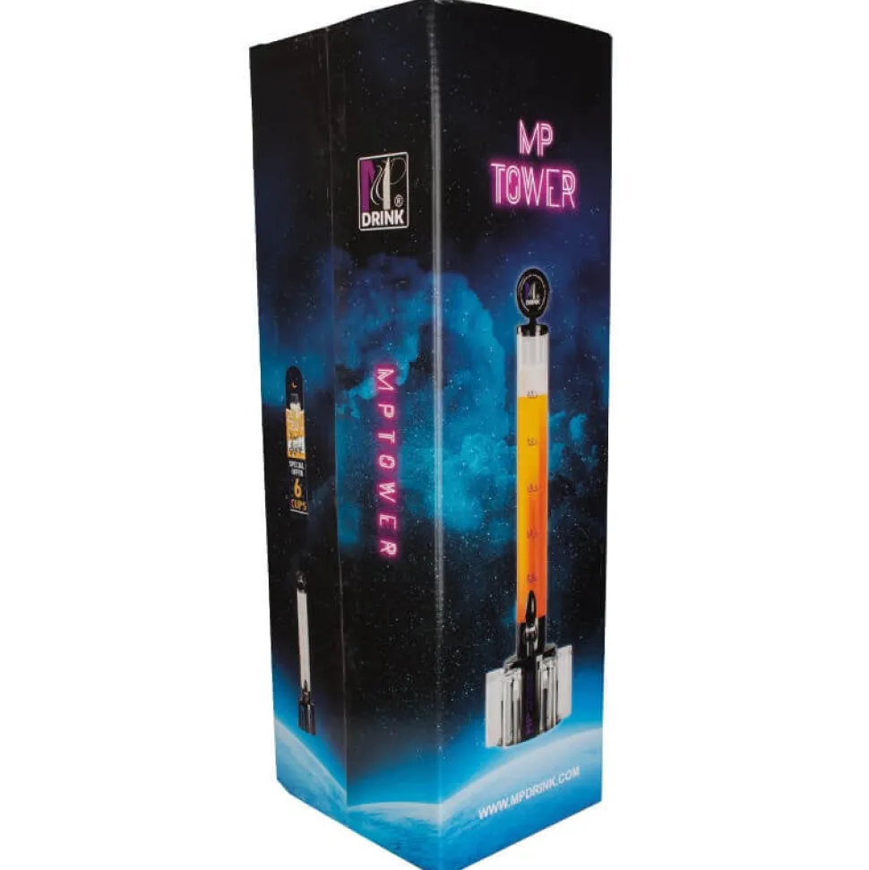 Die Getränkesäule benötigt eine Standfläche von 9cm, denn auch ihre Basis hat diesen Durchmesser. Der Zapfhahn ragt zusätzlich etwa 4,5cm über den Sockel hinaus und befindet sich auf 18cm Höhe. Die Säule ist für Temperaturen von -40 bis +80 °C geeignet. Getränke sollten nicht mehr als 20% Alkoholgehalt haben. Damit eignet sich der MPTower für Bier und viele alkoholische Mischgetränke.
