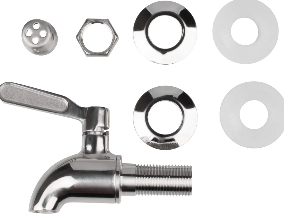 Der enthaltene Zapfhahn kann einfach in das vorgebohrte Loch des Behälters geschraubt werden. Bitte beachten Sie hierzu die kurze Beschreibung am Boden des Behälters. Alle Komponenten des Zapfhahns bestehen aus wertigem Metall mit Ausnahme der Dichtungsringe, welche aus Kunststoff bestehen. Ein Sieb, das auf das Auslaufrohr geschraubt wird, filtert Kerne und Blätter aus dem Getränk, bevor es durch den Zapfhahn läuft.