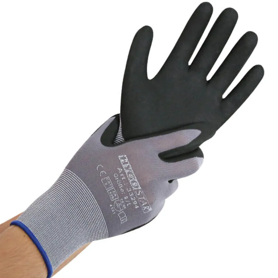 Material: Nylon-Feinstrick, 1/4 Nitril-PU-Beschichtung an Innenhand und Fingerkuppen