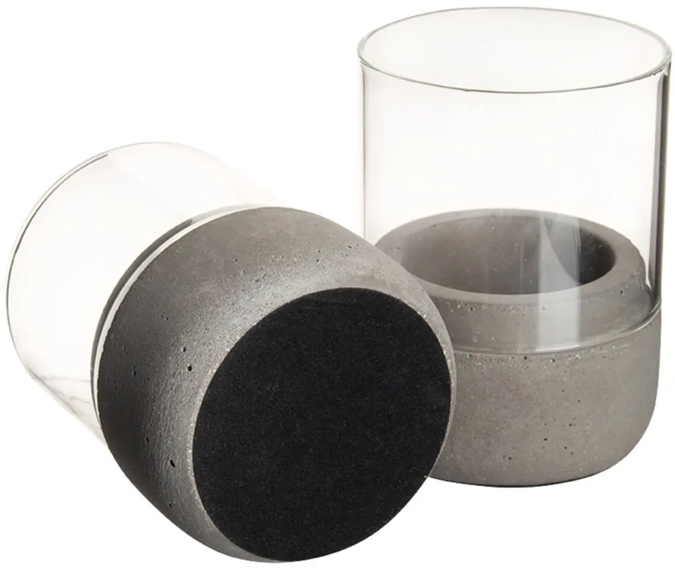In Kombination mit Glas wirkt die graue, glatte Oberfläche edel und schlicht. Der Schein des flackernden Teelichts spiegelt sich im Glaszylinder, während die Flamme sicher vom schützenden Beton umgeben ist.