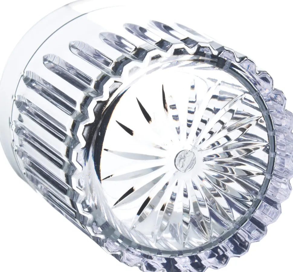 Den zylindrischen D.O.F. Becher zieren tiefe Einkerbungen, die nebeneinander ein Wellenmuster ergeben, das sich über das gesamte Kunststoffglas erstreckt. Das eingekerbte Muster sorgt für Bar-Gefühl und außerdem für einen guten Halt. Im unteren Bereich befinden sich zwei Füllstriche direkt übereinander – einer bei 2cl, der andere bei 4cl. Auch die Unterseite des Becherbodens ist strukturiert, jedoch sind die kurzen Einkerbungen hier strahlenförmig angeordnet und auch in der Draufsicht als Sonne erkennbar.