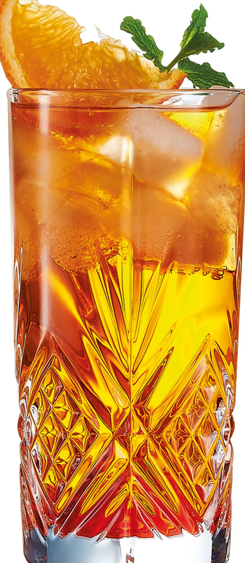 Der Schliff des Glases erstreckt sich dabei hauptsächlich auf der unteren Hälfte und geht nur vereinzelt mit wenigen Ornamenten in die Höhe. Erinnern tun diese an eine Mischung aus einzelnen Palmenblättern und Sternen. Der Schliff beschert dem Glas eine unebene Oberfläche, welche für ein angenehmes Handhaben sorgt. Weiterhin rutschen die Gläser nicht so schnell aus Hand – auch mit feuchten Händen. Letztlich sorgt der Schliff für eine außergewöhnliche Präsentation Ihrer Drinks, da er mit dem Umgebungslicht spielt.