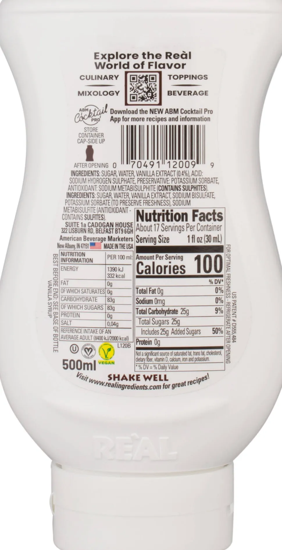 Zutaten: Zucker, Wasser, Vanilleextrakt (0,4%), Säuerungsmittel: Natriumhydrogensulfat, Konservierungsmittel: Kaliumsorbat, Antioxidationsmittel: Natriummetabisulfit (enthält Sulfite).