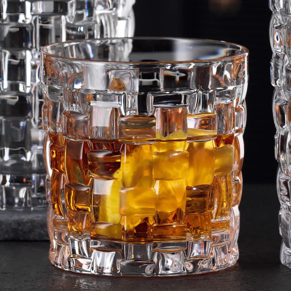 In diesem Tumbler der Bossa Nova Serie von Nachtmann können vornehmlich Whisky und kleine Cocktails serviert werden. S.O.F. steht dabei für Single Old Fashioned, was auf den typischen Umfang des Cocktail-Klassikers anspielt und das Volumen von 250ml erklärt. Um den Inhalt bestmöglich zu präsentieren ziert das kleine Glas ein großflächiger Schliffmuster an den Seiten. Dies zeigt ein geflochtenes Korbmuster aus dreidimensionalen Rechtecken, welches einerseits Grifffestigkeit gewährleistet und andererseits für stimmungsvolles Lichtspiel sorgt. Der S.O.F. Tumbler ist 8,4cm hoch und 8cm breit.