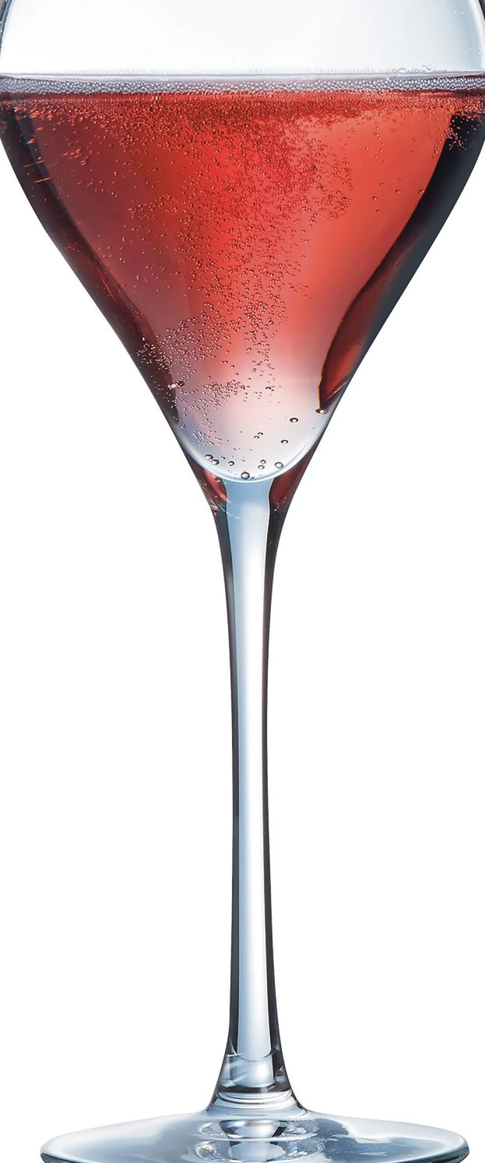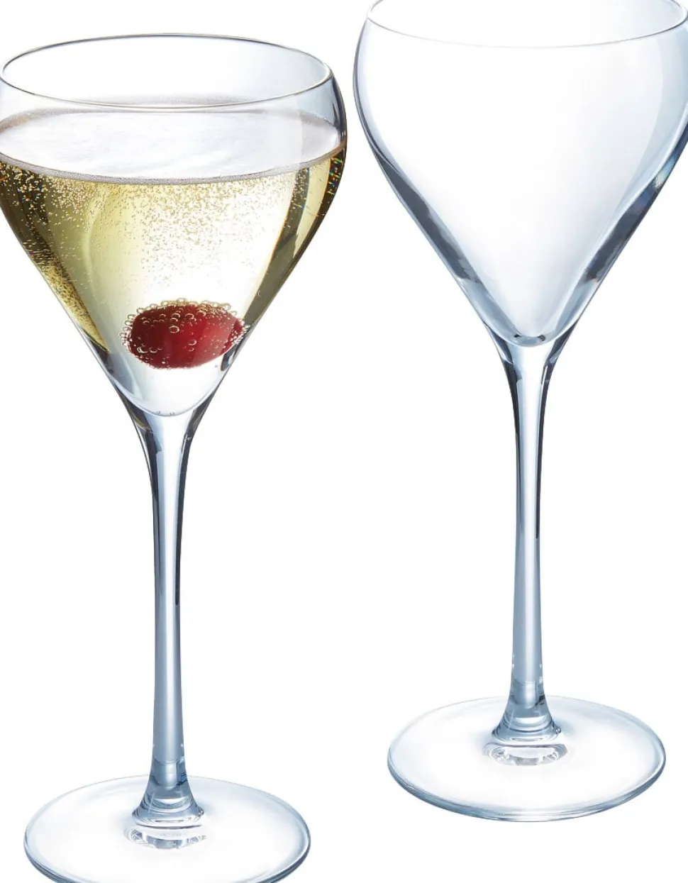 Im unteren Teil wirkt der Kelch wie eine Sektflöte und läuft zum Stiel hin schmal zu. Oben weiten sich die Wände hingegen und erreichen kurz unter dem Rand den größten Durchmesser. Der Rand neigt sich dann wieder etwas nach innen. So ergibt sich eine Schalenform, die Sekt und Cocktails eine große Oberfläche bietet.