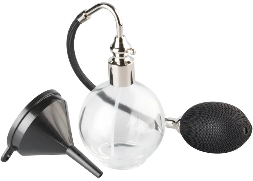 Handelsübliche Pumpzerstäuber leisten zwar gute Arbeit, sehen aber nicht immer auch gut aus. Ganz anders dieser elegante Flakon mit seinem fein gearbeiteten Kopf aus bestem Edelstahl und dem schwarzen, ummantelten Druckball.