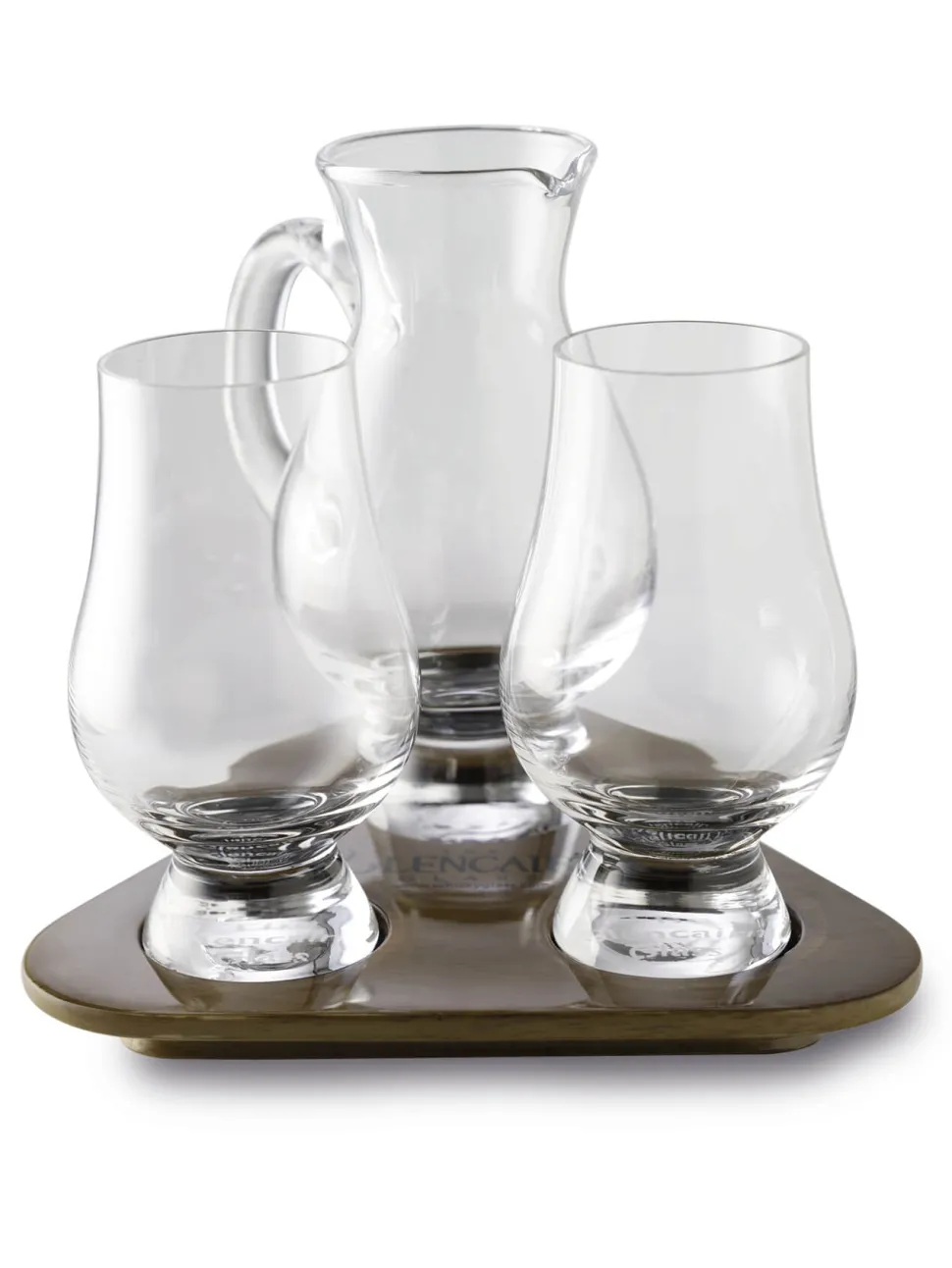 Auf dem dreieckigen, braunen Holztablett finden Sie zwei The Glencairn Gläser mit jeweils einemVolumen von 190ml und einen 0,5l Wasserkrug.