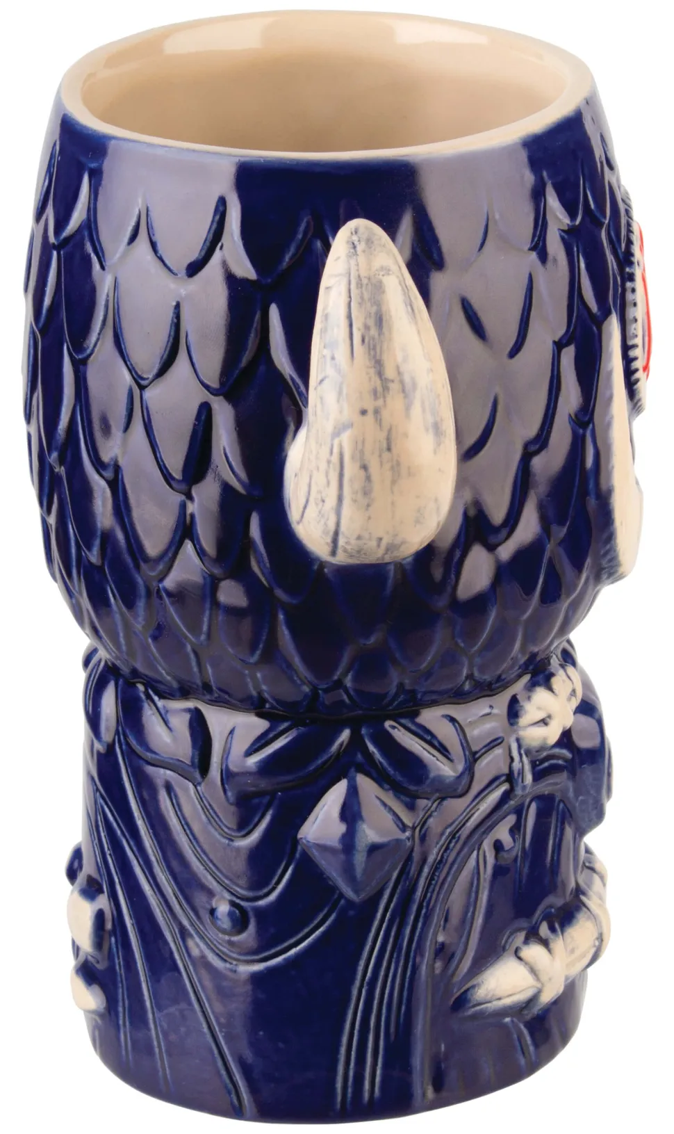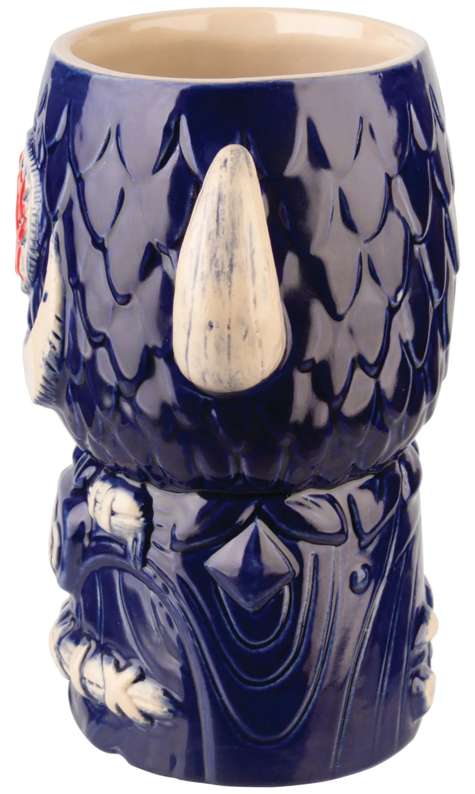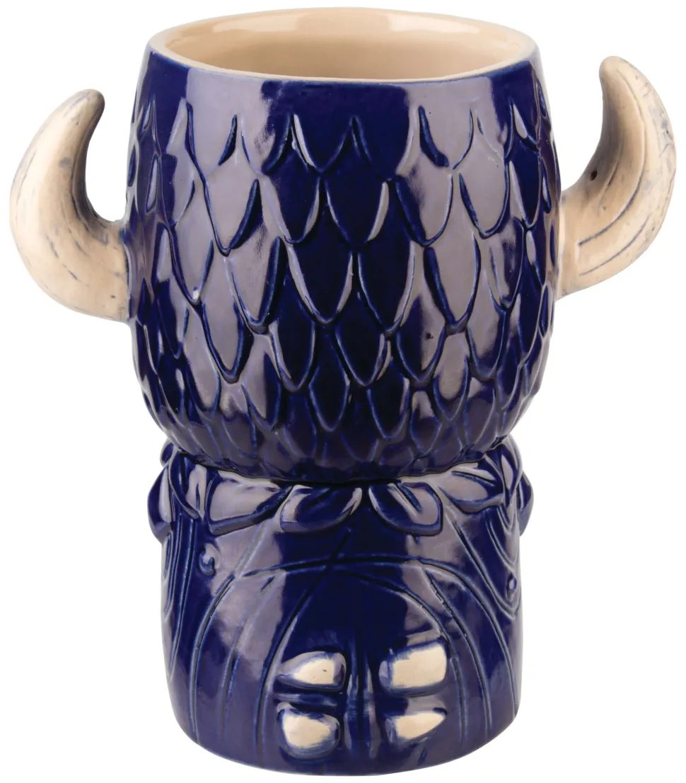 Der leuchtend blaue Keramikbecher ist etwa 17cm hoch und hat ein Volumen von 800ml. Ein besonderes Highlight sind die beiden Büffelhörner zu beiden Seiten. Sie sind stabil genug, um den Becher daran zu halten. Der comichafte Cocktailbecher ist rundherum plastisch gestaltet, wobei der Fokus auf der Vorderseite mit dem Gesicht und Kopfschmuck des Büffels liegt.