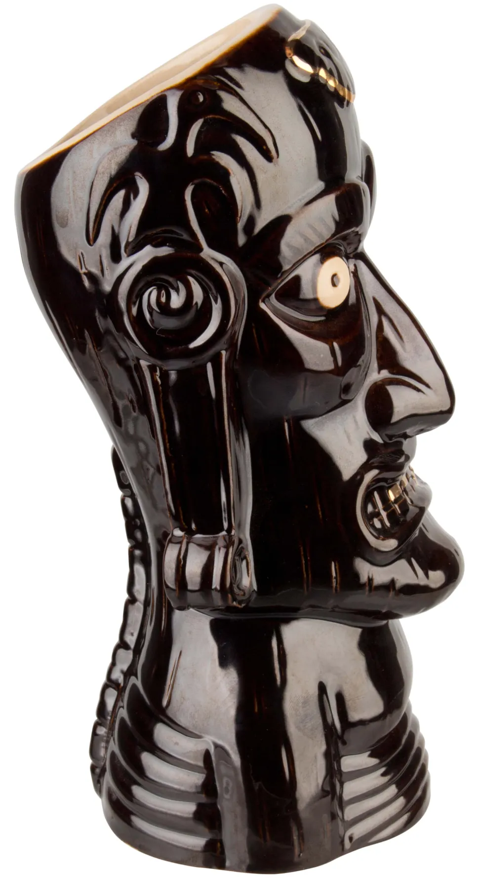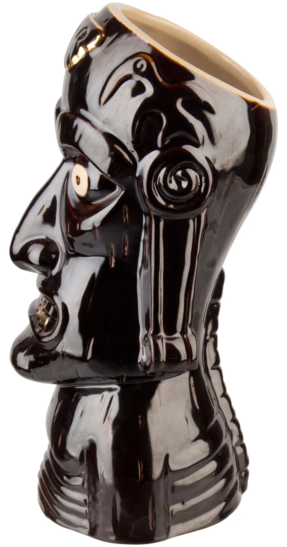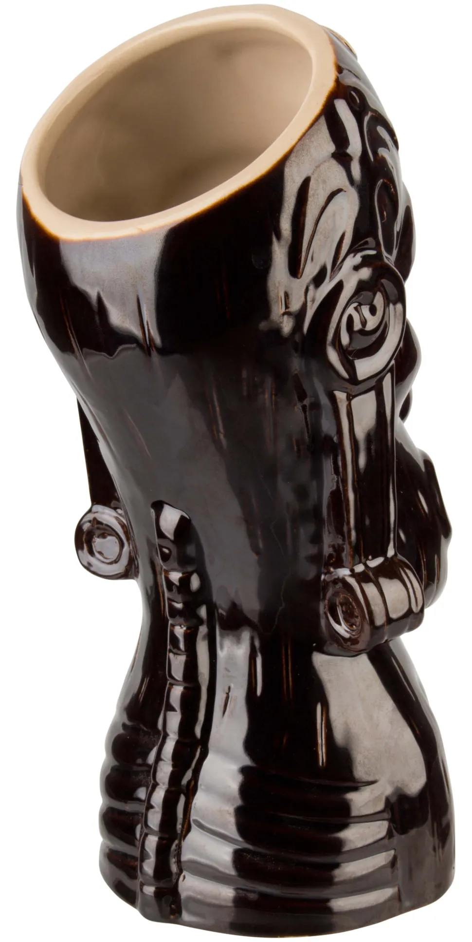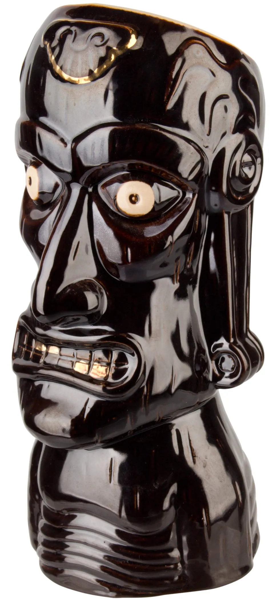 Der Becher ist vorne etwas höher als hinten und an der höchsten Stelle 21cm hoch. Der Tiki bietet Platz für etwa 450ml Cocktail oder Mocktail und ist innen wie außen glasiert.
