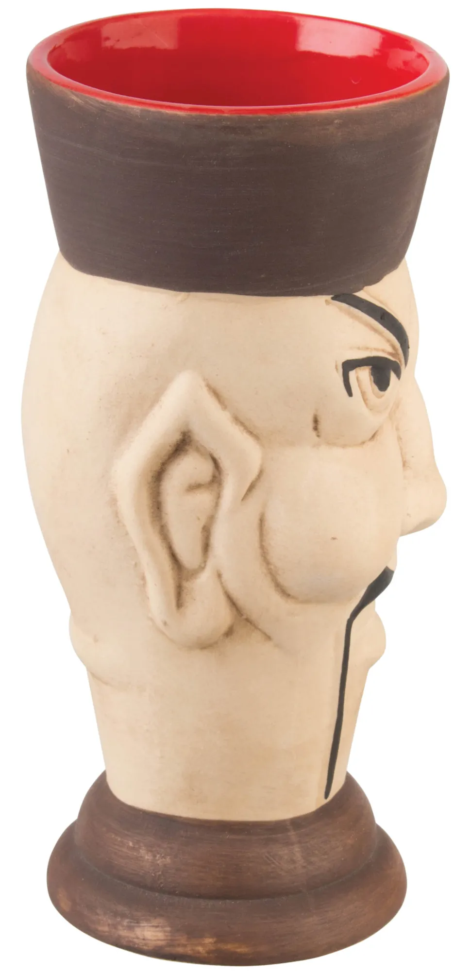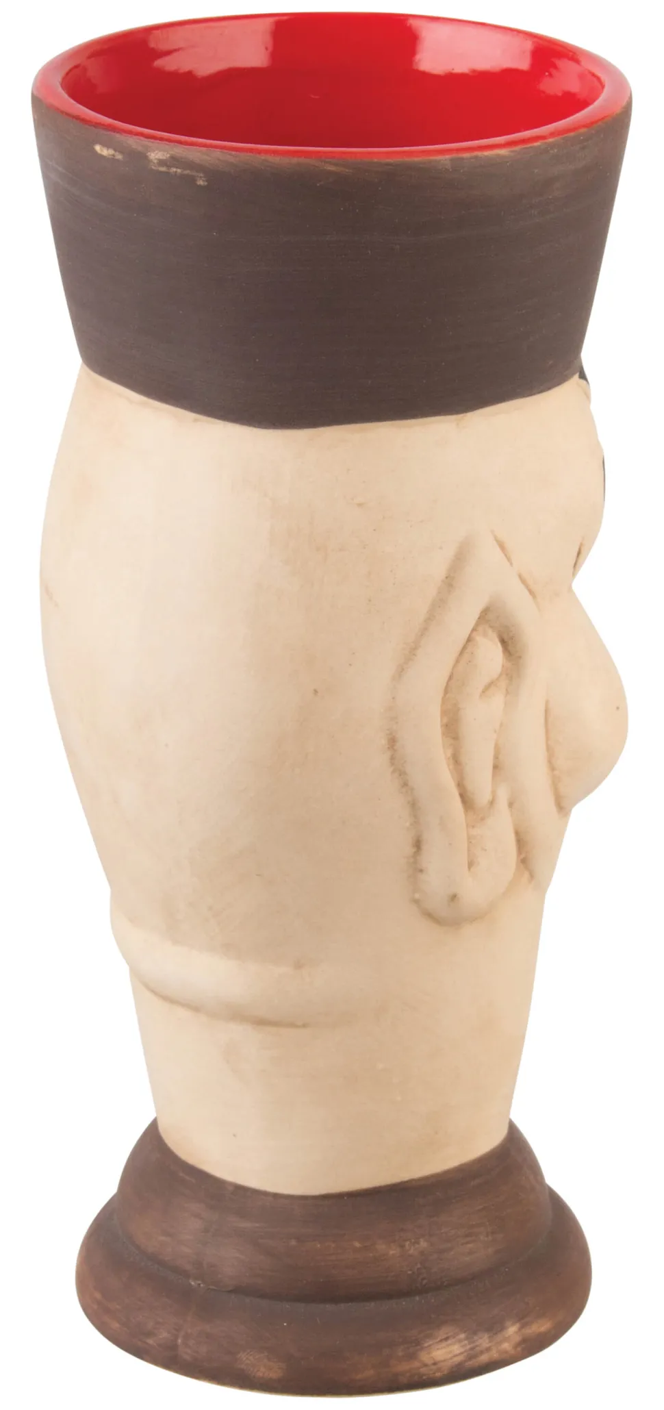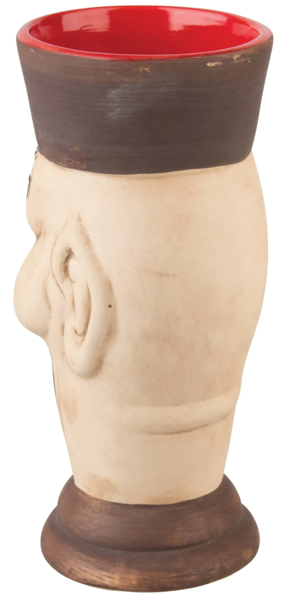 Der Keramikbecher ist außen beige und braun bemalt, während er innen rot lasiert ist.