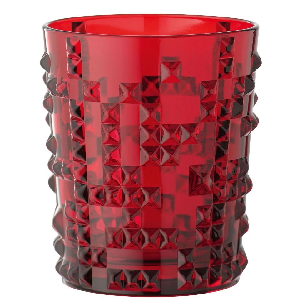 Das Kristallglas ist rubinrot gefärbt, bleibt dabei aber noch leicht transparent. Erhebungen in der Form von Nieten sind wild über den Tumbler verteilt. Es ist das Erkennungsmerkmal der Gläser-Serie, welche die Punk-Kultur feiert und das Rebellische mit der typischen Eleganz und Qualität von Nachtmann Gläsern verbindet.