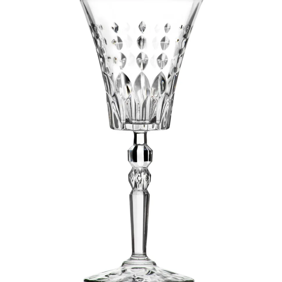 Der nach oben 9cm weit offen stehende Kelch ist mit einer Anordnung aus Ovalen verziert, die rundum gleichmäßig verteilt sind und zum Rand hin immer kleiner werden. Sein Grund ist dickwandig, kreisrund und verhält sich parallel zum Boden. Der edle Trinkkelch thront auf dem achtkantig geschliffenen Stiel, an dessen oberen Ende sich zwei unterschiedlich designte, beinahe kugelige Abschnitte befinden. An seinem unteren Ende geht der Stiel mit einer kleinen Kante in den Standfuß des Weinglases über. Dieser wölbt sich hohl nach oben und ist mit einem etwas dezenteren Schliffmusster aus Diamanten und Dreiecken versehen. Apropos: „Diamonds are a girl’s best friend“, sang Marilyn Monroe einmal. Ihrer Figur und diesem Song zollt die gleichnamige RCR-Kollektion ihren wohlverdienten Tribut!