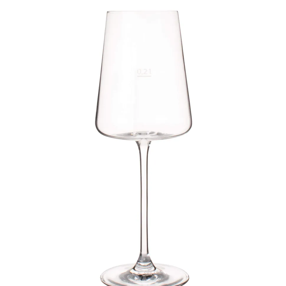 Der Weinkelch ist mit einem Füllstrich für 0,2l bestückt, der in den Kelch eingraviert ist. Um diese Markierung so unauffällig wie möglich zu machen befindet sich die dazugehörige CE Kennzeichnung in der Bodenplatte. Dadurch ist das Weinglas verlässlich geeicht und dennoch steht der Wein im Mittelpunkt.