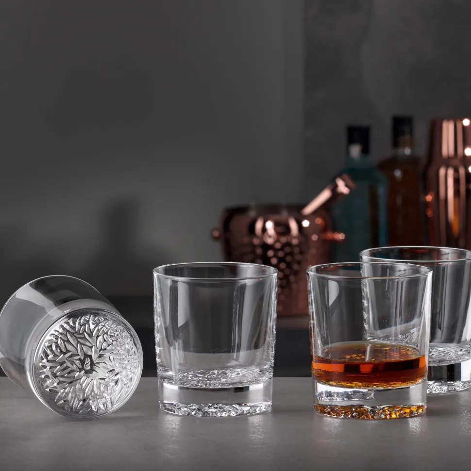 Von der Form her ist der Tumbler ein schlichtes, rundes Trinkglas; der Clou des Designs ist allerdings das Bodeneis: Spiegelau bezeichnet das dreidimensionale Dekor auf der Unterseite als „Swarm-Motiv“ (Schwarm-Motiv). Beim Servieren werden Ihre Gäste sicher von der Tatsache begeistert sein, dass sich die Farbe des Drinks in diesem Motiv widerspiegelt!