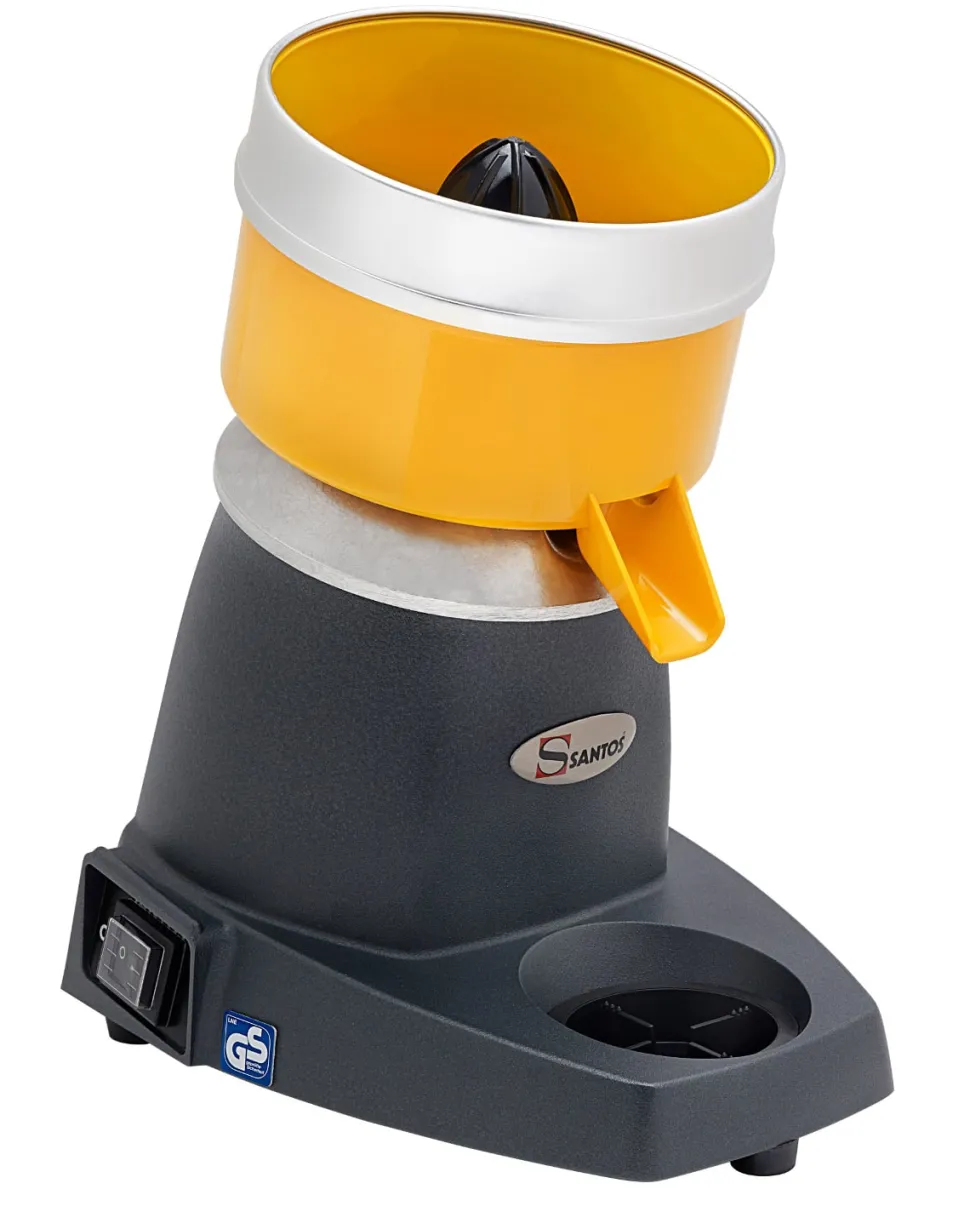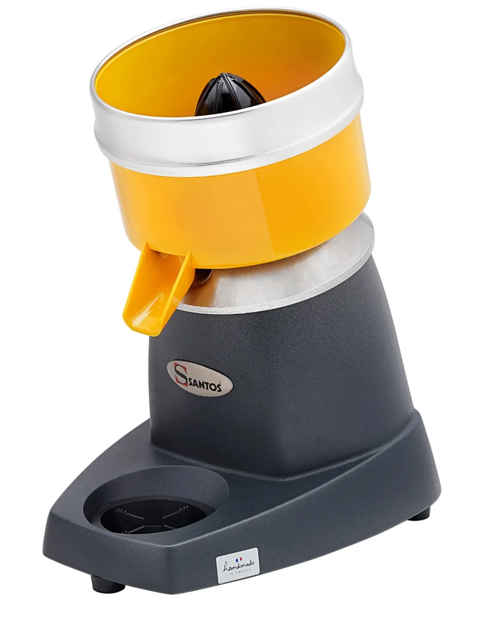 Eine zeitnahe und gründliche Reinigung ist bei Zitruspressen besonders wichtig, da die Fruchtsäure verschiedene Materialien angreift und früher Abnutzungserscheinungen auftreten. Nicht zuletzt sind eingetrocknete Fruchtfleischreste ein großes Ärgernis, das Sie vermeiden können, wenn Sie die Fruchtsaftpresse gleich nach dem Gebrauch reinigen. Einzelne Teile, wie der Saftbehälter, die Presskegel und das Auffangsieb sind leicht entfernbar und lassen sich in der Spülmaschine oder per Hand spülen. Der Saftbehälter der Santos 11G ist aus Kunststoff gefertigt, da dieser die Säure besser aushält als Metalle. Selbstverständlich ist der Kunststoff lebensmittelecht und sogar nach NSF Standards zertifiziert. Wir empfehlen, auch die Basis aus lackiertem Aluminiumguss regelmäßig mit einem feuchten, weichen Tuch zu reinigen.