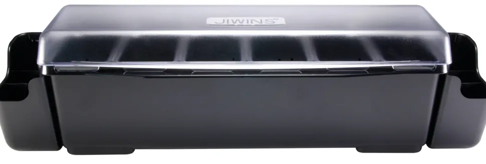 Das Gehäuse der Box ist in schlichtem schwarz gehalten, die Einsätze, sowie der Deckel sind transparent. Dieser ist mittig an den Seiten an der Box angebracht, lässt sich so leicht über den Container drehen. Wenn Sie den Deckel komplett öffnen, können die einzelnen Container leicht eingehangen werden.