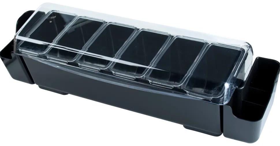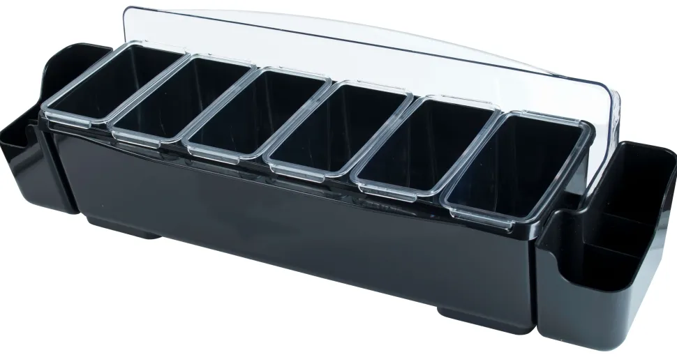 Hinter der Bar, in der Küche und im Eiscafé muss es schnell gehen. Zugleich ist hygienisches Arbeiten unerlässlich. Für einen reibungslosen Ablauf sorgt der Premium Zutatenbehälter von Prime Bar. Er ist mit sechs Kunststoffbehältern ausgestattet. Jeder Behälter fasst 0,9l. Sie können zum Befüllen und Reinigen unkompliziert einzeln entnommen werden. Ein durchsichtiger Deckel sorgt für den Schutz des Inhalts, während Sie zugleich den Inhalt im Blick behalten. Der Deckel wird zum Öffnen und Schließen einfach vor und zurück geklappt. So müssen Sie ihn im Trubel nicht suchen und er kann nicht verloren gehen.