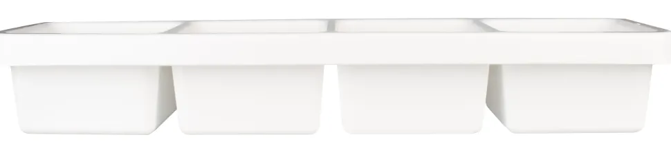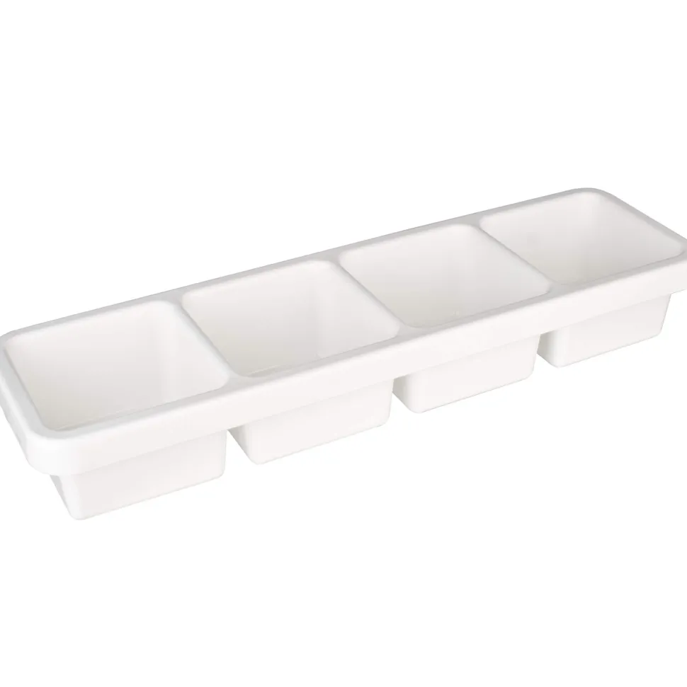 Dieser weiße Zutatenbehälter verfügt über 4 Fächer mit jeweils 600ml Volumen. Der Behälter besteht aus Kunststoff und ist leicht zu reinigen. Hinter der Bar können Sie darin griffbereit und übersichtlich Ihre Cocktailzutaten und -garnituren aufbewahren. Die mittelgroßen Fächer eignen sich zum Beispiel für Zitronenscheiben, Ananasstücke oder Limetten-Hälften; genau so jedoch auch für Kräuter, Gewürze oder Zuckerperlen.