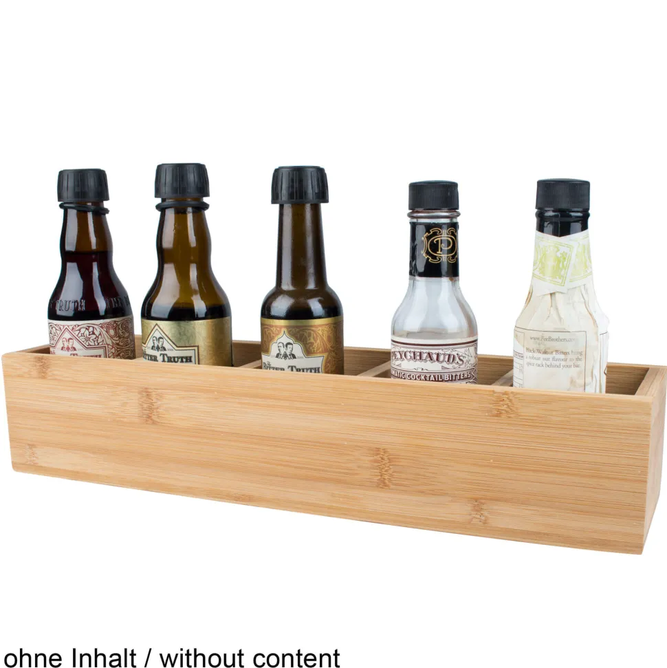 Die schöne Box aus naturbelassenem Bambus kann dabei wahlweise auf dem Gästetisch, auf der Bar oder einem Empfangscounter stehen. Die Einsatzmöglichkeiten sind unbegrenzt. Die fünf gleichgroßen Fächer haben die Maße 6,5cm x 8,0cm und dienen zur übersichtlichen Aufbewahrung von Verbrauchsartikeln.