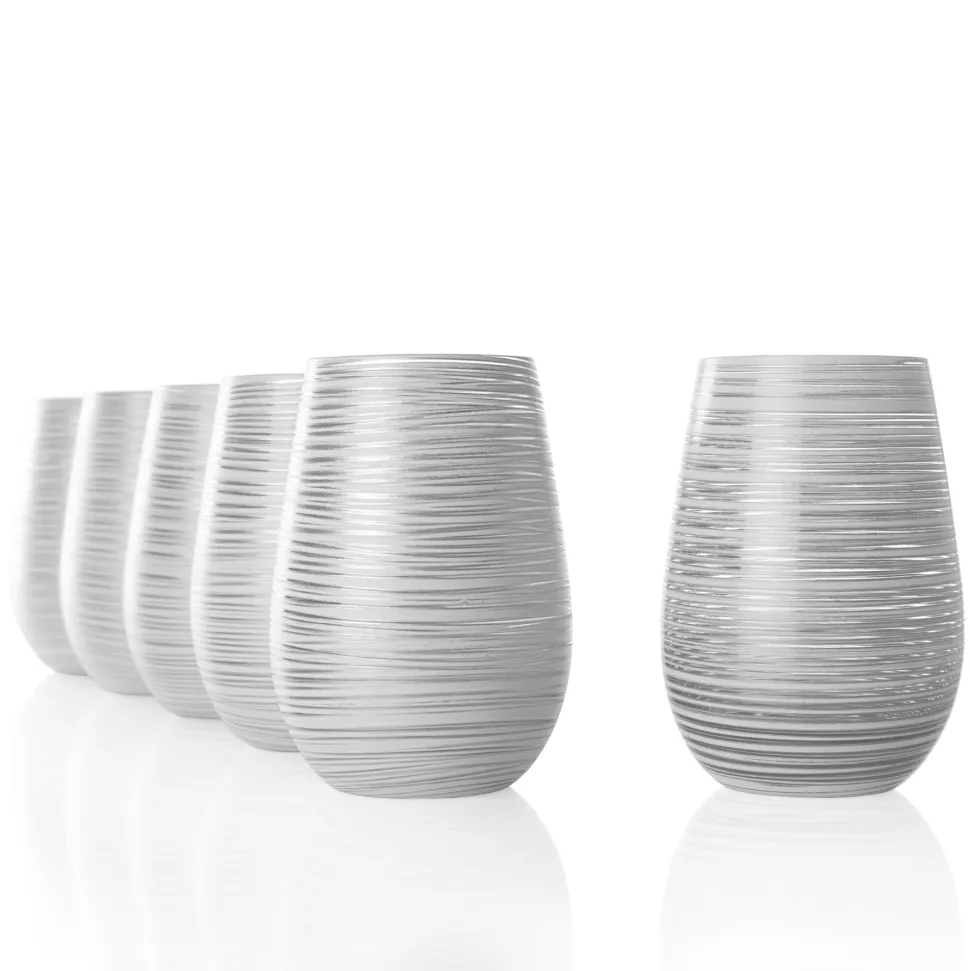 Der Becher scheint schlicht in einem Gewand aus umlaufenden weißen und gräulich silberfarbenen Linien. Die schimmernde Struktur auf der Außenseite des Glases ist auch ein besonderes haptisches Erlebnis. Zu dem auffälligen Design gesellen sich erstklassige Eigenschaften, wie ein geschliffener Trinkrand und Spülmaschinenbeständigkeit. Auf der Innenseite sieht man die silbrige Farbe durchschimmern, jedoch ist das Glas dort glatt. Die Becherform liegt angenehm in der Hand und ist für viele Getränkesorten geeignet.