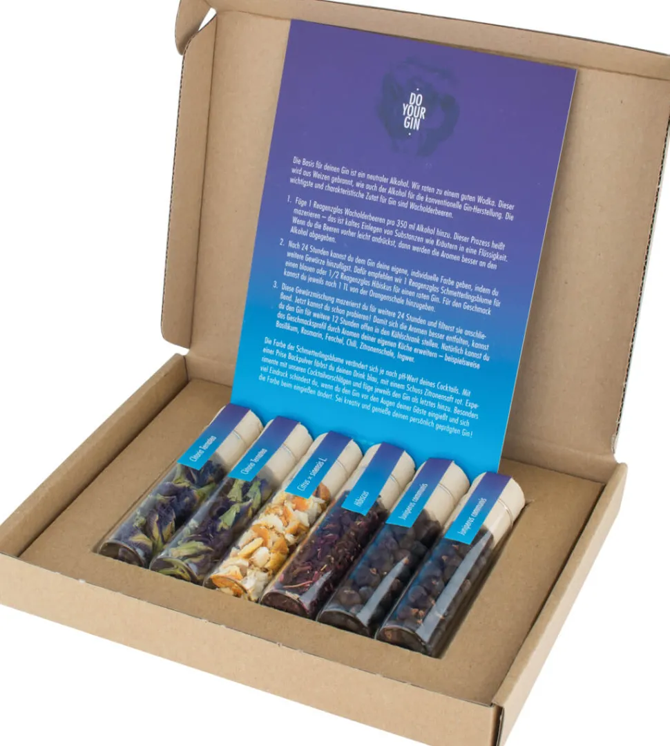 Zuerst gibt man pro 350ml getreidebasierten Alkohols 1 Röhrchen Wacholderbeeren hinein und lässt das Ganze 24 Stunden ziehen, sodass sich das typische Grundaroma von Gin bildet. Im zweiten Schritt wird der DIY-Gin gewürzt und zugleich gefärbt, wobei die Schmetterlingsblume eine blaue und der Hibiskus eine rote Färbung ergibt. Nun muss das Getränk erneut 24 Stunden ziehen, wird dann gefiltert und kann anschließend nach Wahl mit eigenen Gewürzen weiter abgeschmeckt werden.